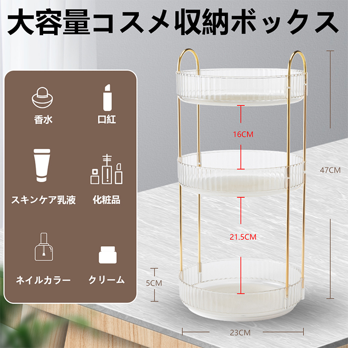 【3段大容量】 23cm - 化粧収納ボックスは3層の大容量設計で、化粧水、フェスクリーム、マニキュアなどのスキンケアや化粧品を30~40本収納できます。日常的なニーズを満たし、スペースを80%節約できるので、散らかりがちな化粧台ともおさらばできます!