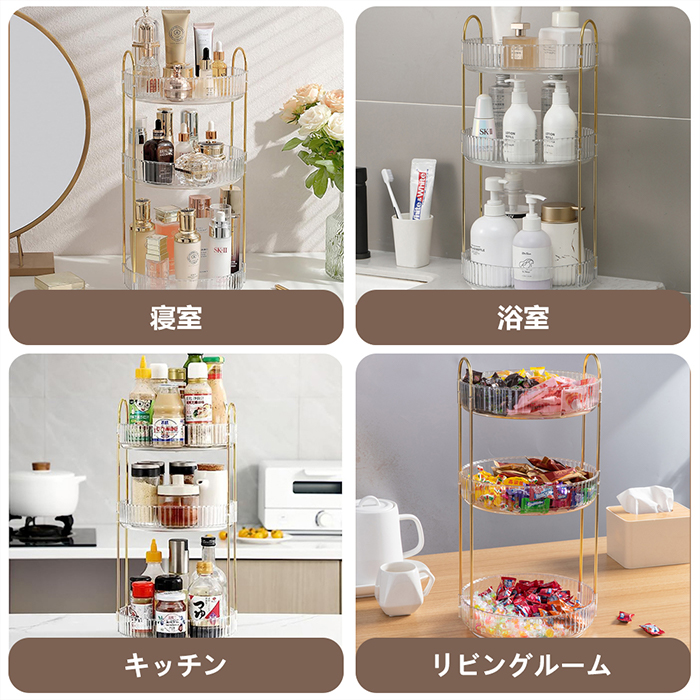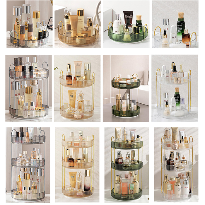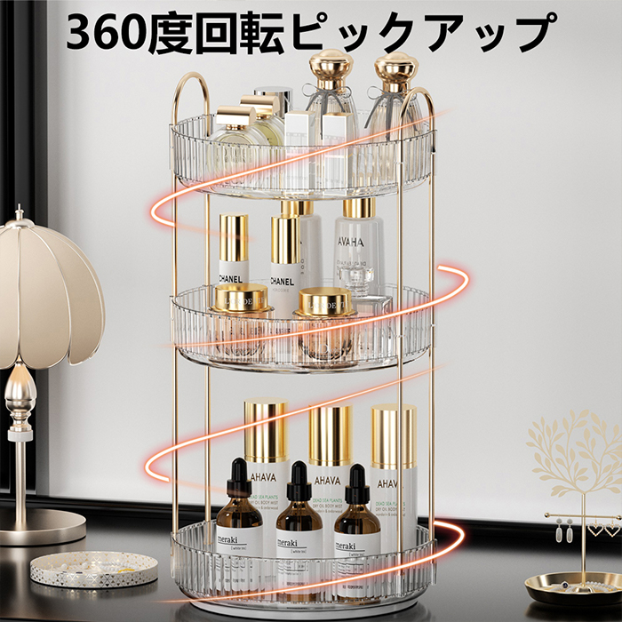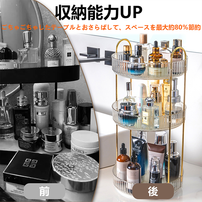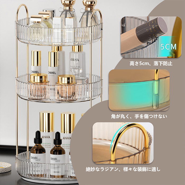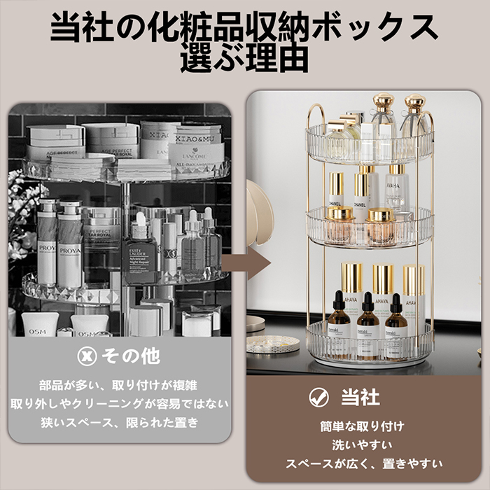 【360度回転メイクボックス】 360度回転し、化粧品を取りやすく、より便利で効率的なライフスタイル体験をお届けします。回転台座は滑らかで、トレイエッジが高く、回転時の化粧品の落下を防止し、浴室収納やスキンケア用品収納の理想的な選択です。