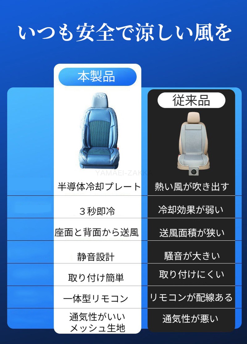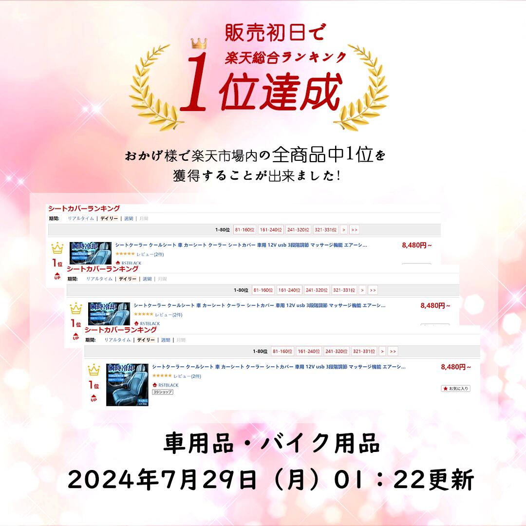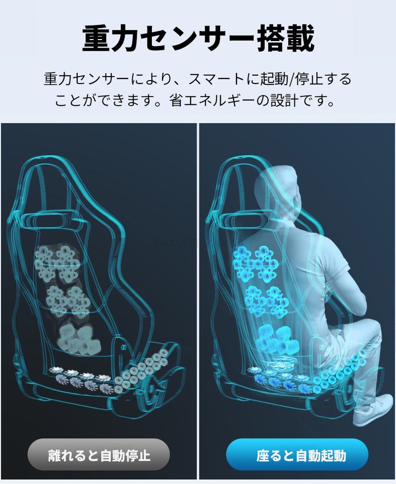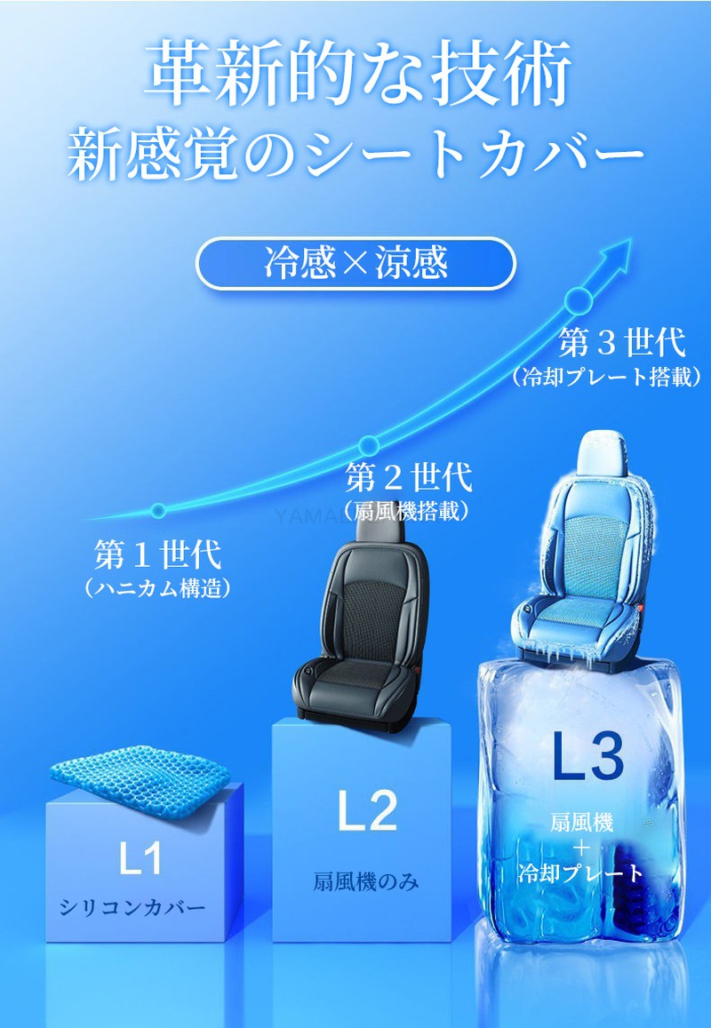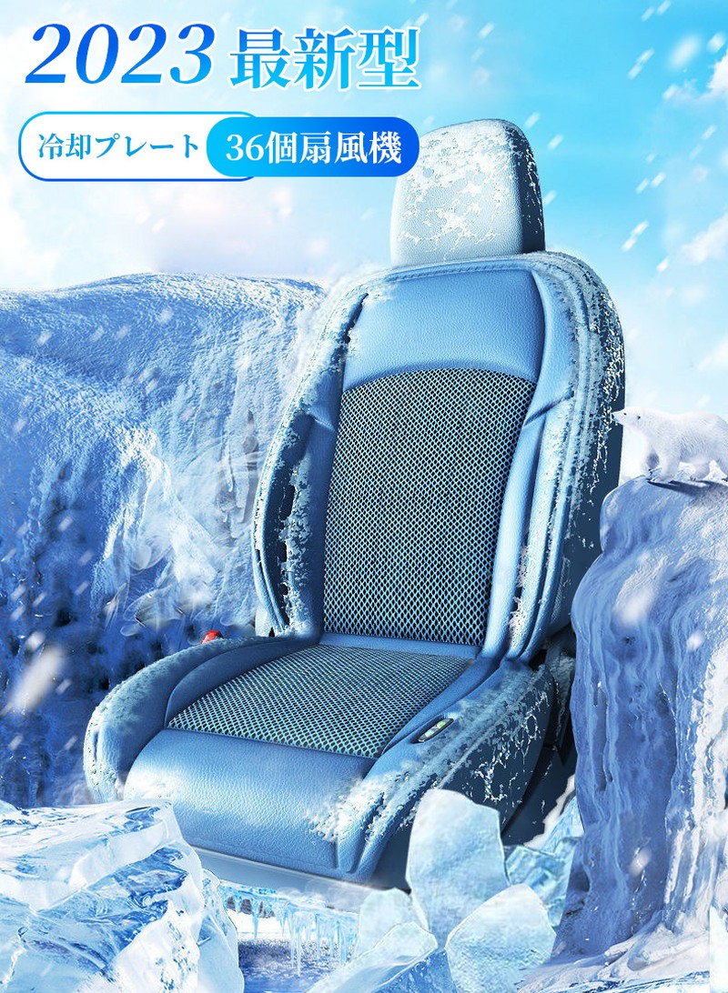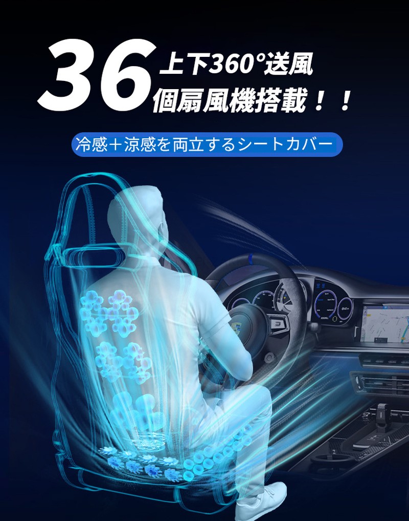 クーラーカーシートに冷風扇風機28枚搭載されており、背席面は12枚、座席+太もも面は16枚内蔵されています。冷たい風を送ってくれて、エアコンの感じで太ももから背中までひんやり爽快!長距離運転も汗をかかず快適です。夏場のドライブの必需品!熱中症対策にぴったり!冷温カーシートではありませんので、長時間座っても胃腸への負担がありません。
