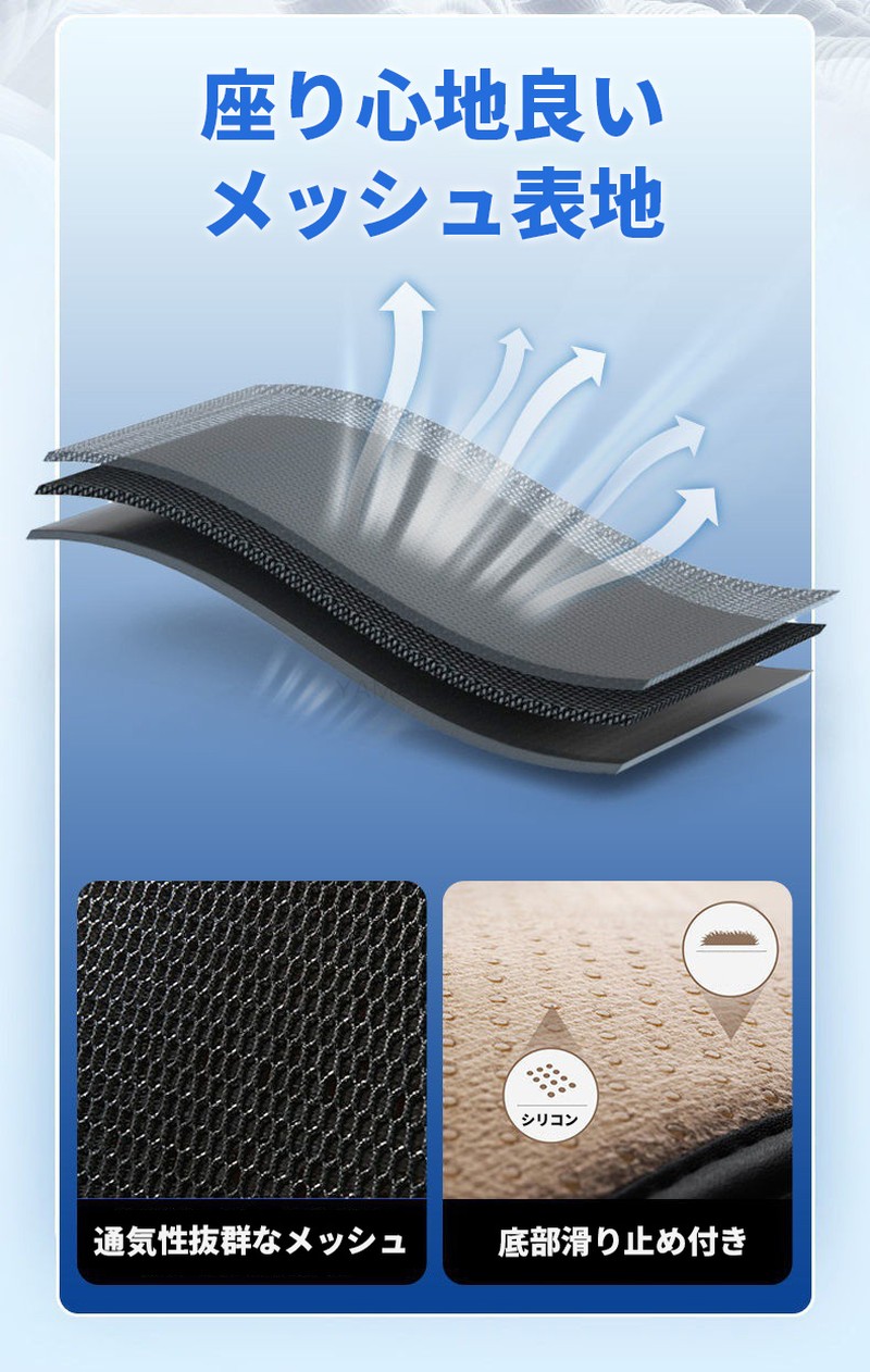 立体構造のハニカムメッシュを使用しており、熱がこもらず通気性抜群で、涼しく快適です。高反発マットのような適度な硬さと柔らかな弾力で体圧を分散させ、長時間運転でも疲れにくいです。お手入れも簡単で、濡れた柔らかいタオルで拭いてください。クールシートカバーの裏面には滑り止め加工付きで安定に固定され、ズレ落ちないです。