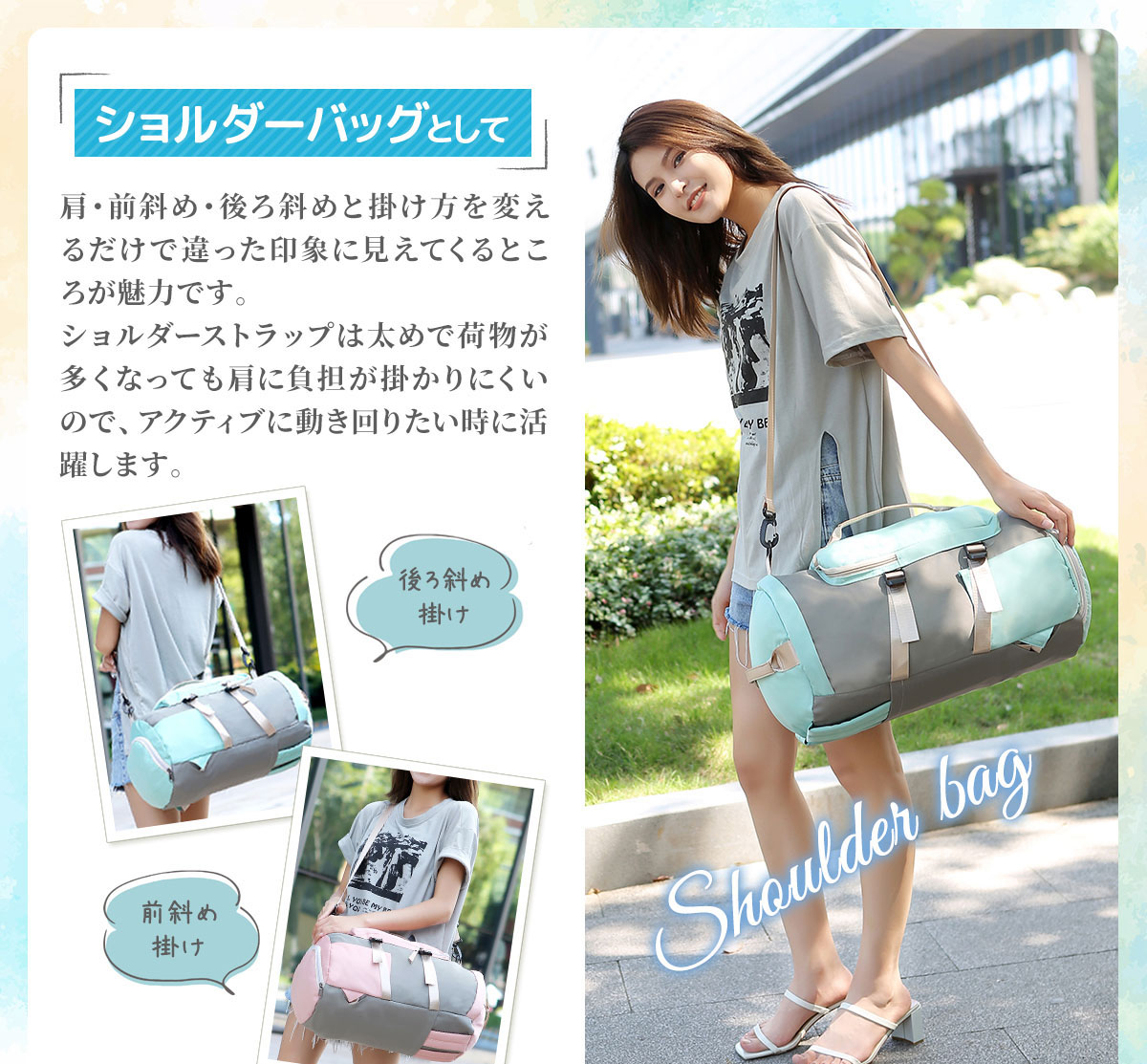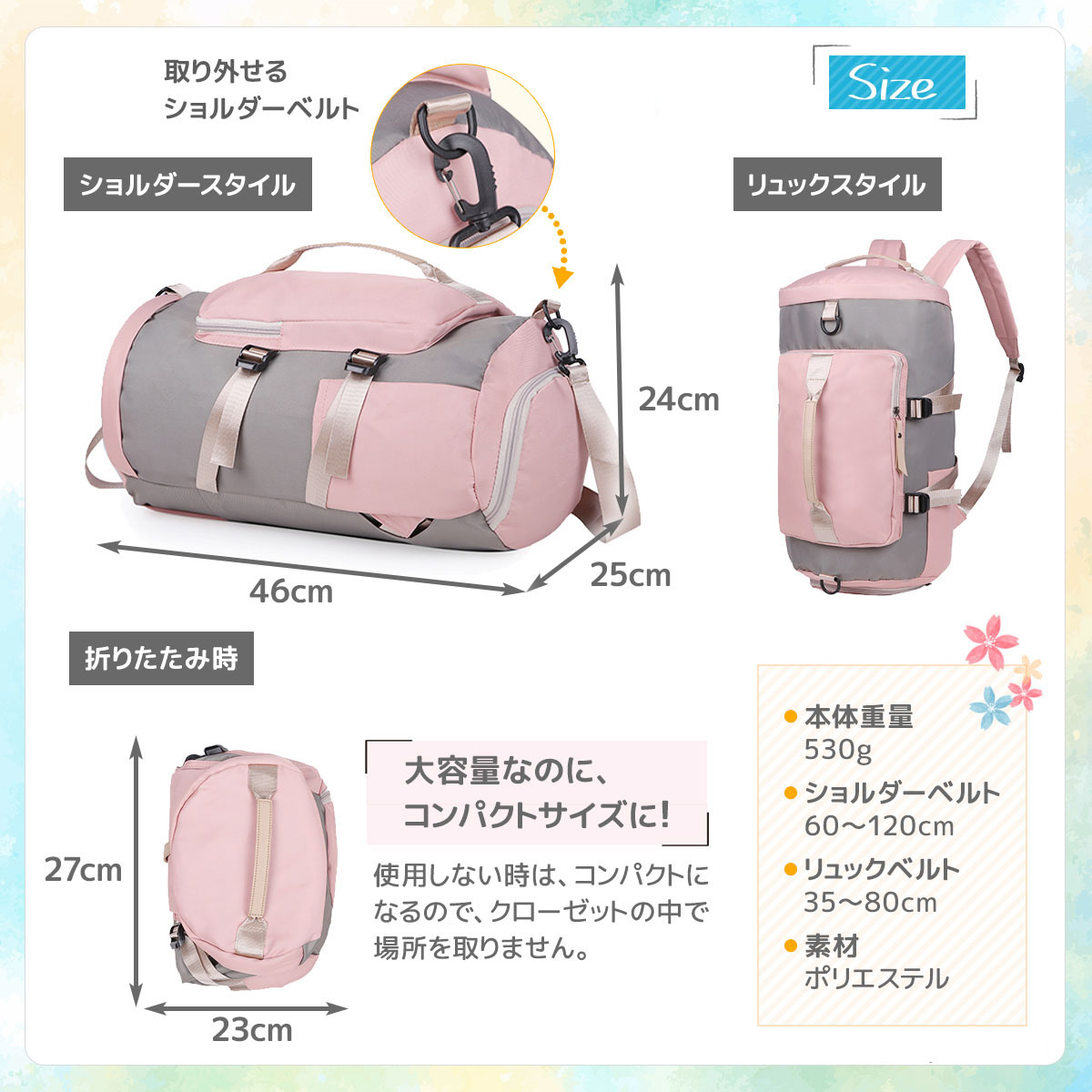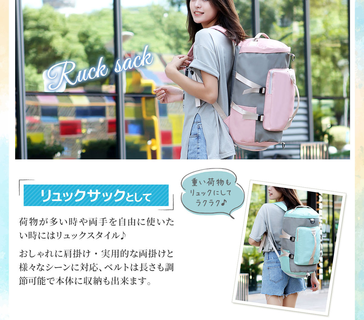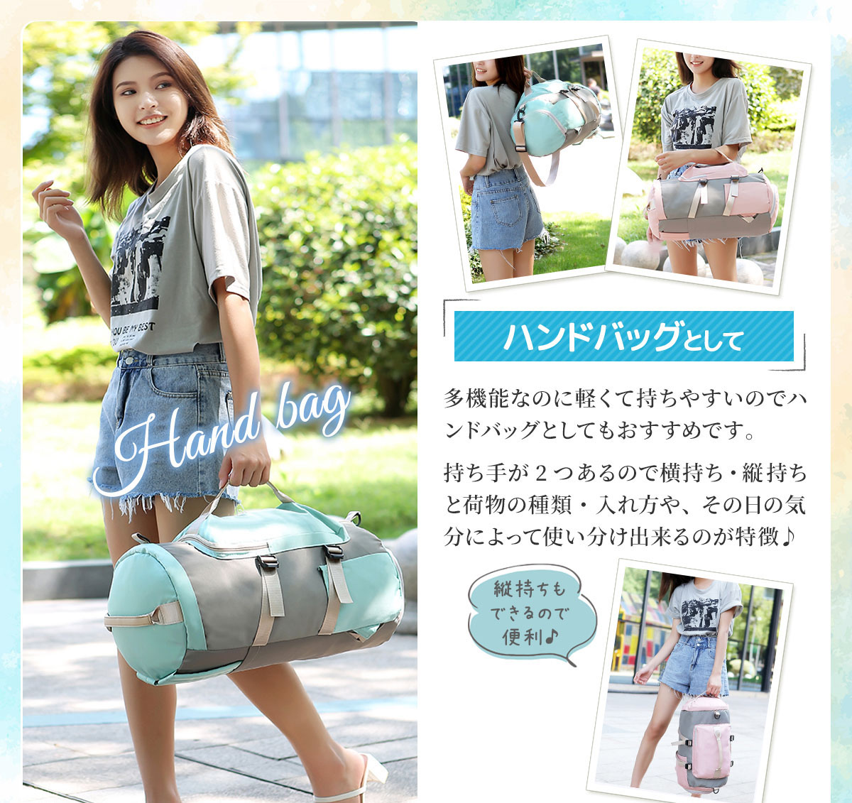 【幅広い用途】 3way仕様なので手持ち(ハンド)、肩掛け・斜めがけ(ショルダー)、リュックサックとシーンによって使い分け出来ます。またスポーツバッグ、ダッフルバッグ、プールバッグ、ジム・ヨガバッグ、旅行・出張・部活用バッグ等、スポーツからアウトドアに普段使いのタウンユース、小学生・中学生の修学旅行と幅広い場面で活躍します。