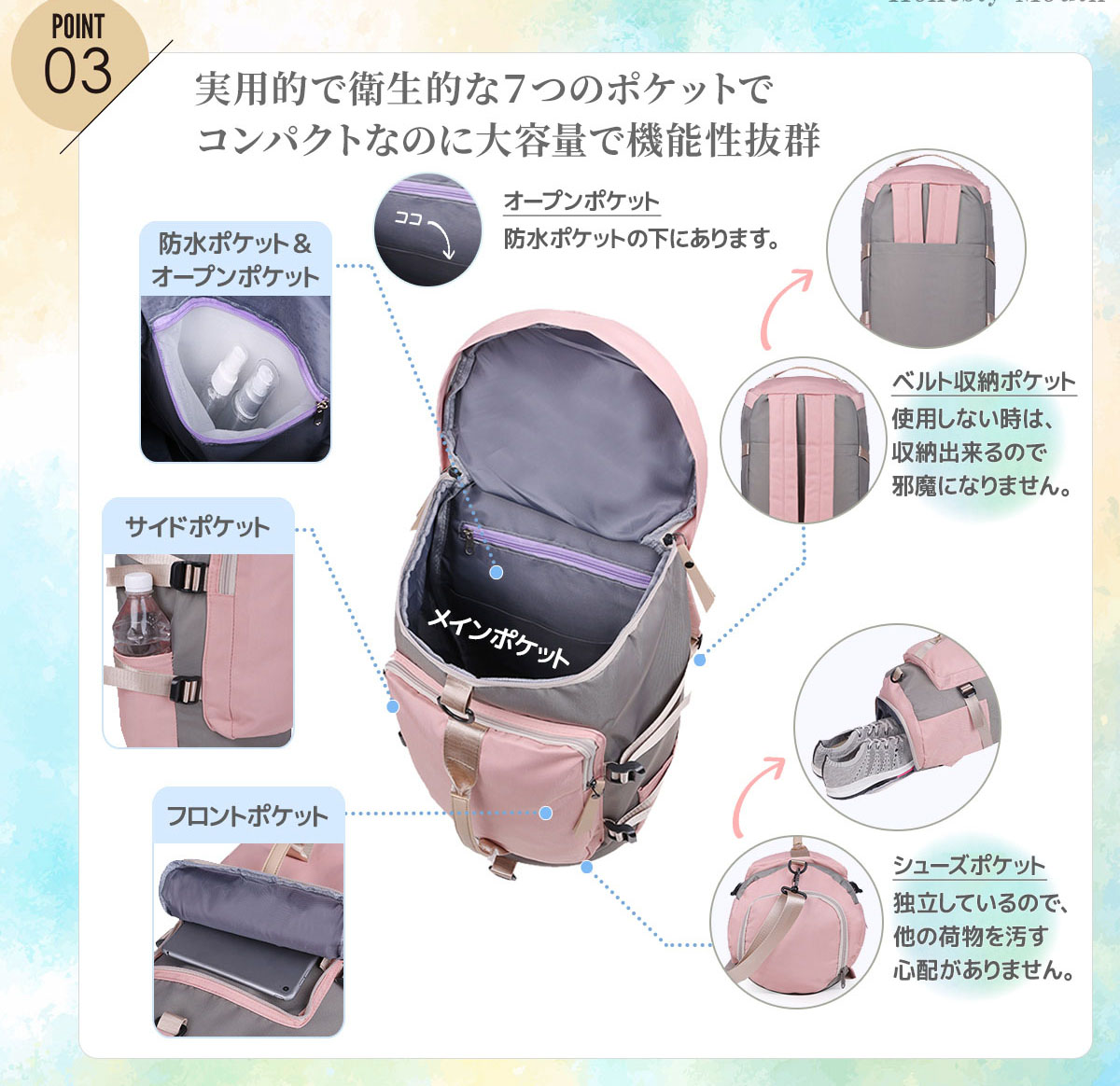 【商品詳細】 メインポケットの他にシューズ(靴)ポケット、濡れた荷物(衣類・小物)を収納できる防水ポケット、サッと取り出せるフロントポケット、しっかり収納サイドポケット、バッグ内部のオープンポケット、リュックベルト収納ポケットと実用的で衛生的な7つのポケットでコンパクトながら大容量で機能性抜群。