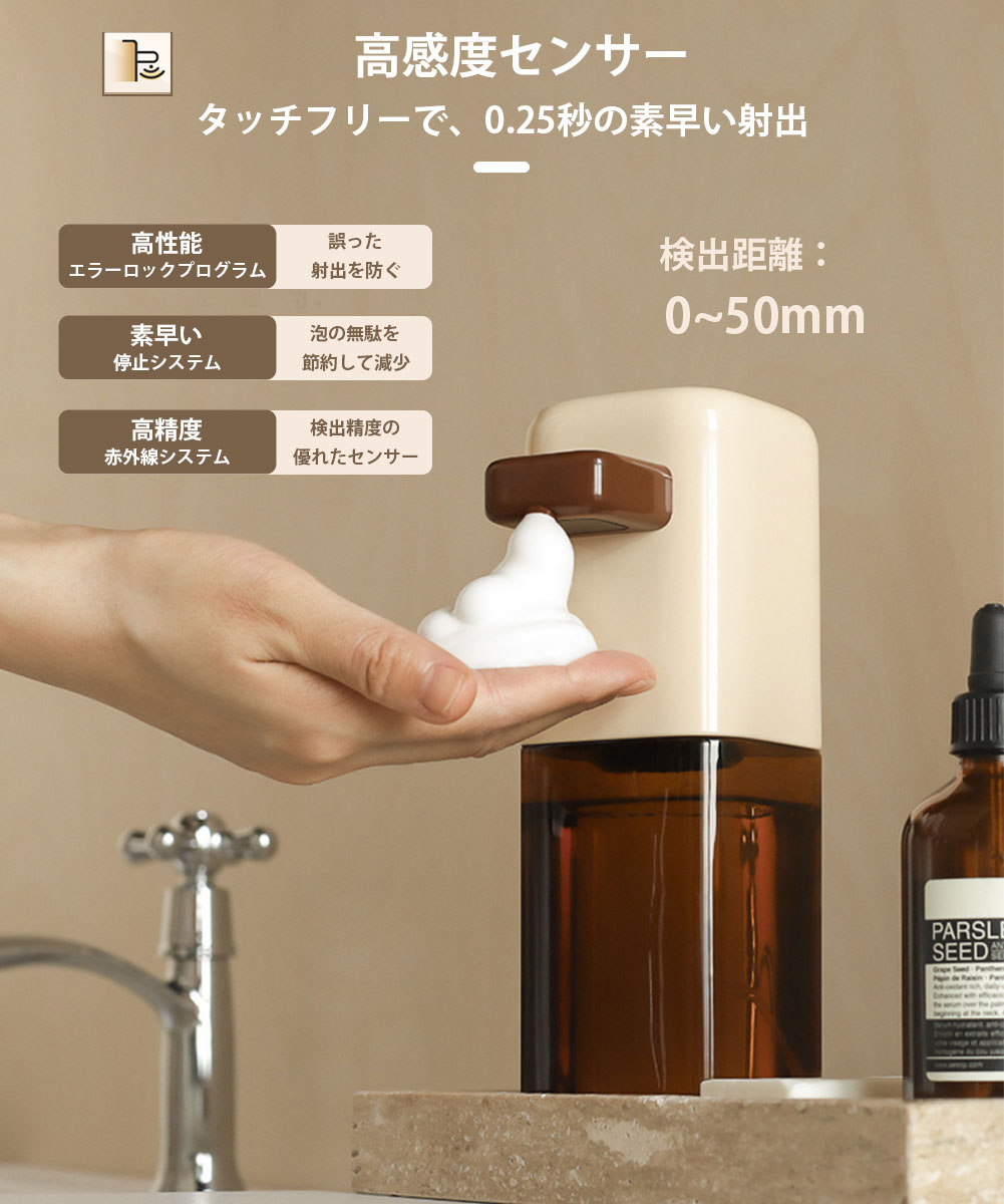1.高感度センサーを搭載し、手を伸ばし0.25秒で泡ソープが射出されます。検出精度も優れていますので、誤った射出も少なく、ソープの無駄使いをせずにご使用いただけます。