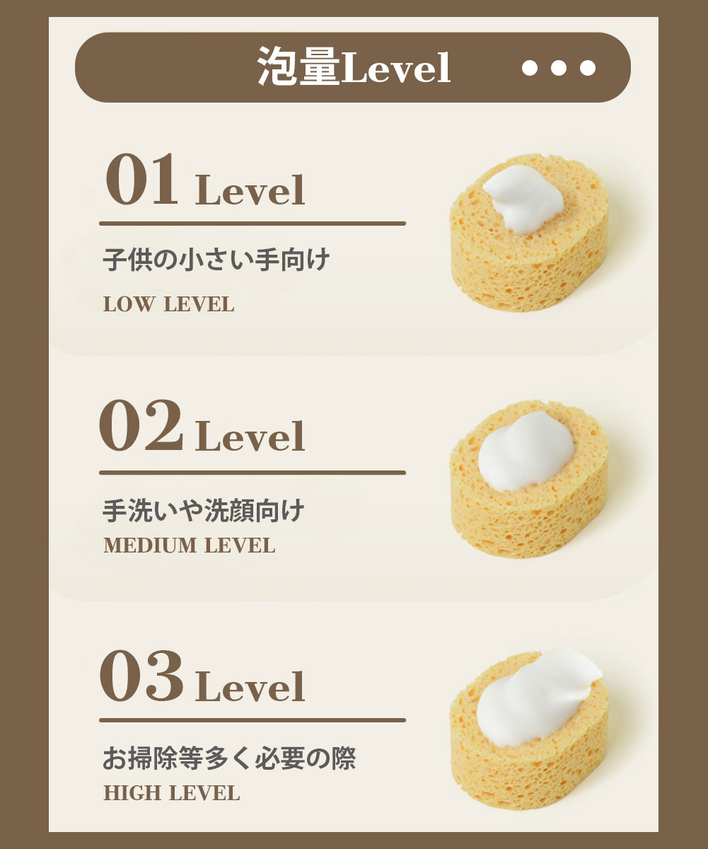 2.上部のボタンを押していただくことで、3段階の出量調整を行えます。お子様の小さな手には少ない量を、お掃除等たくさん必要な際は多い量を設定できる、ライフスタイルに合わせたご活用をいただけます。