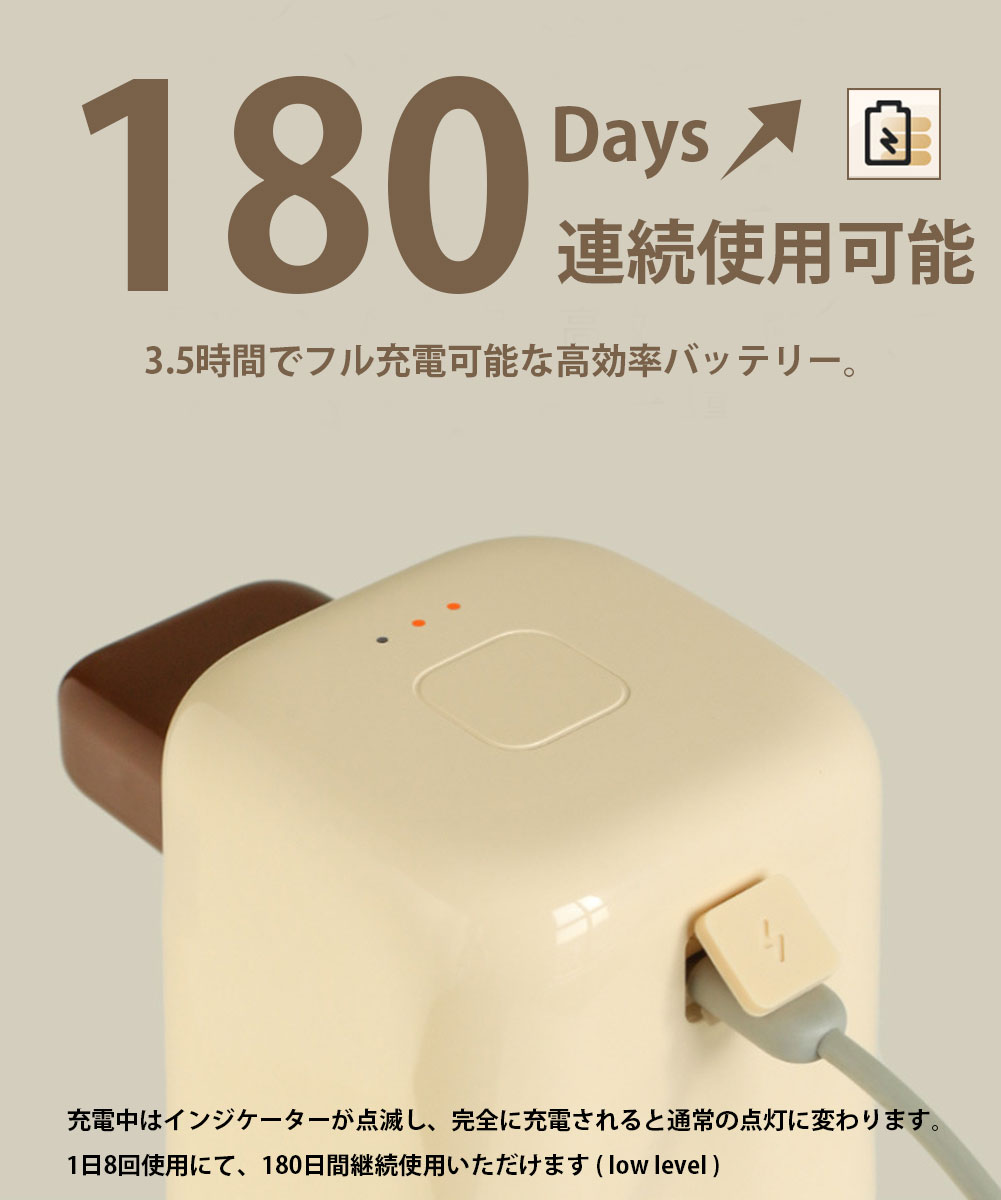 6.高効率バッテリーを搭載しておりますので、180日間連続で使用いただけ、充電も3.5時間で完了いたします。