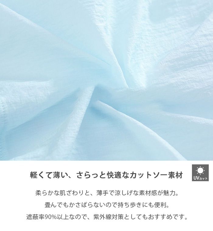 薄手で軽量な素材を使用しているため、持ち運びにも便利で、夏の外出時にさっと羽織ることができます。
