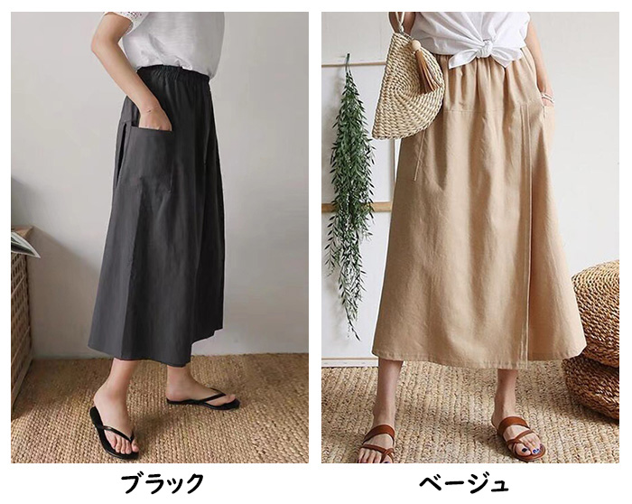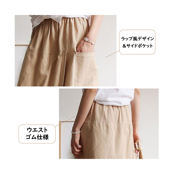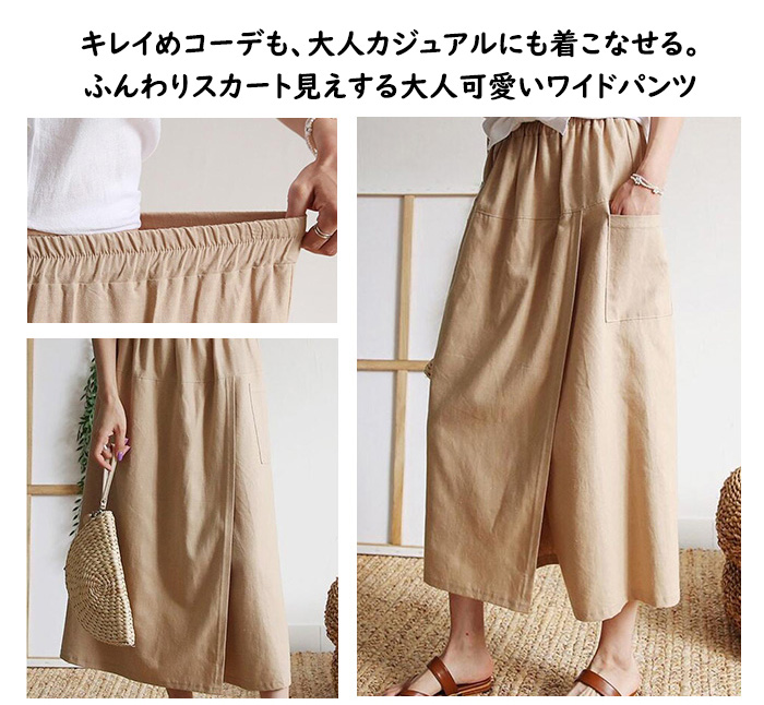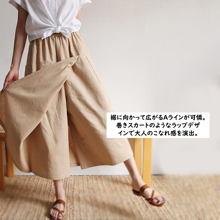 レディース ボトムス ガウチョパンツ ラップスカート風 キュロットパンツ 春 夏 春夏 ワイドパンツ 無地 スカーチョ ポケット ラップパンツ 綿麻 涼しい スカート ウエストゴム 9分丈 ナチュラル ゆったり 30代 40代 50代