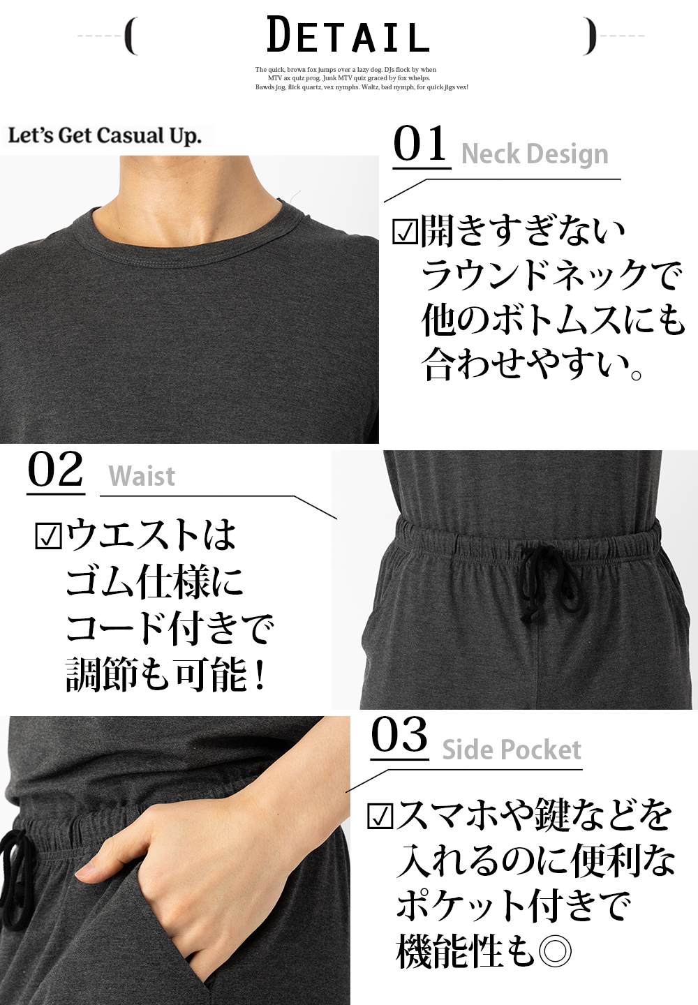 ・【日常使いもOKなデザイン】きれいめ感のある半袖と半ズボンのセットなので、宅配便の受け取りやゴミ出しなどもそのまま行け、シャワーを浴びたジム帰りなどでもそのまま帰宅できるシンプルでスタイリッシュなデザインです。