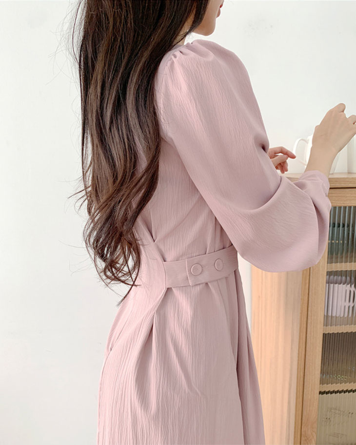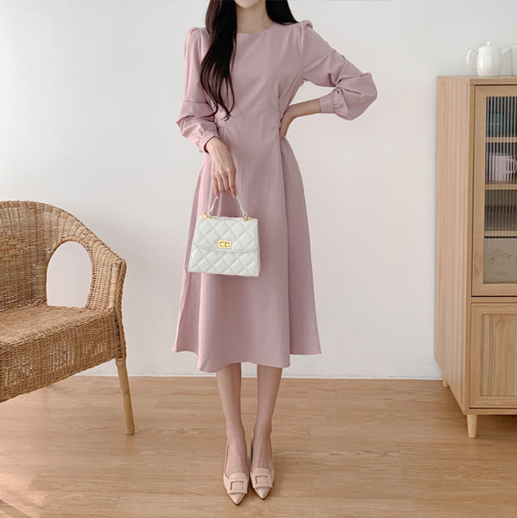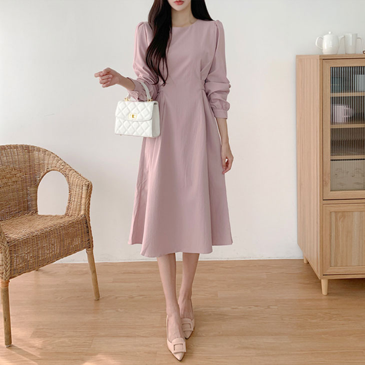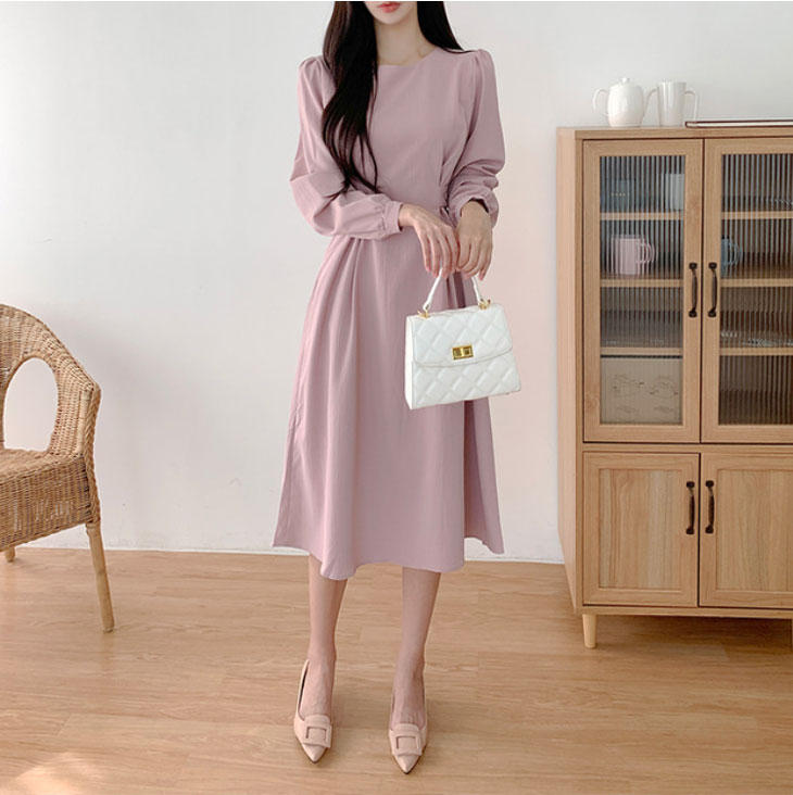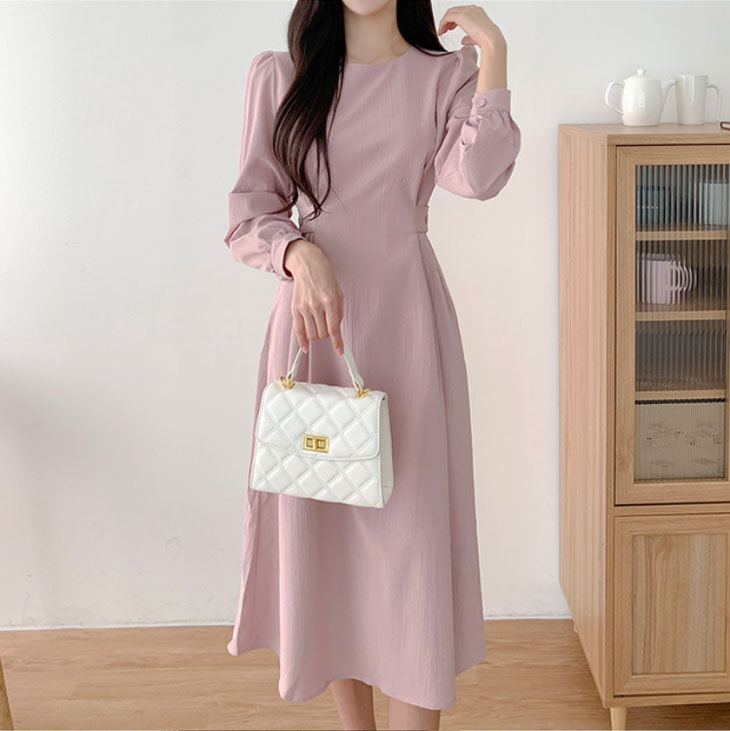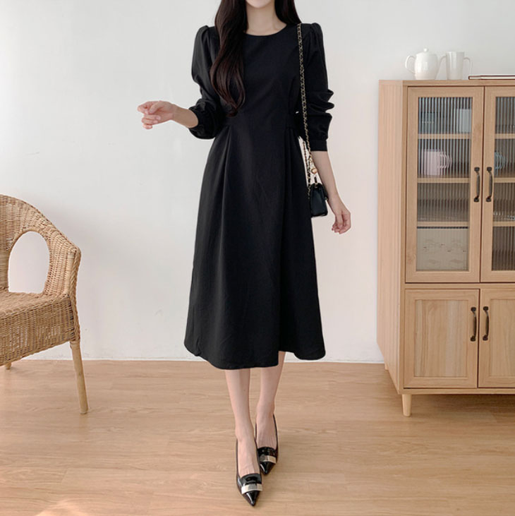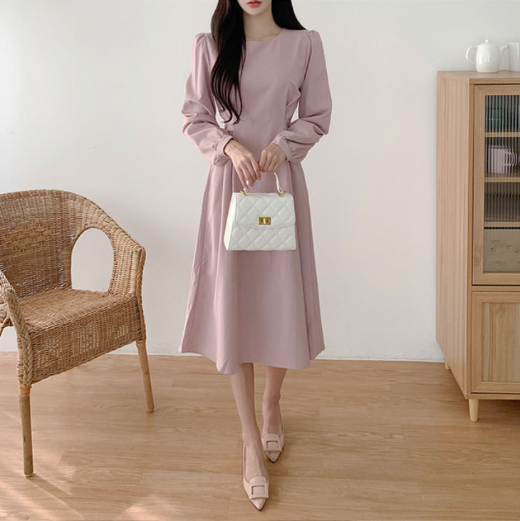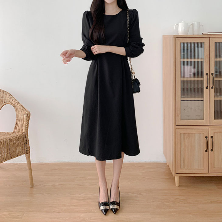 ワンピース レディース ロングワンピース ワンピ シック ラウンドネック きれいめ ミモレ丈 ランタンスリーブ おしゃれ 可愛い フォーマル パーティー ドレス フリルスカート 韓国ファッション