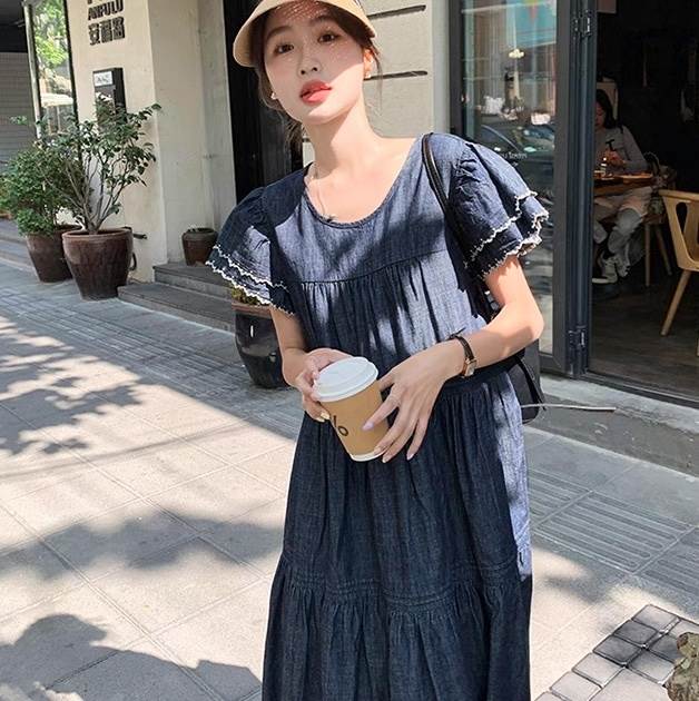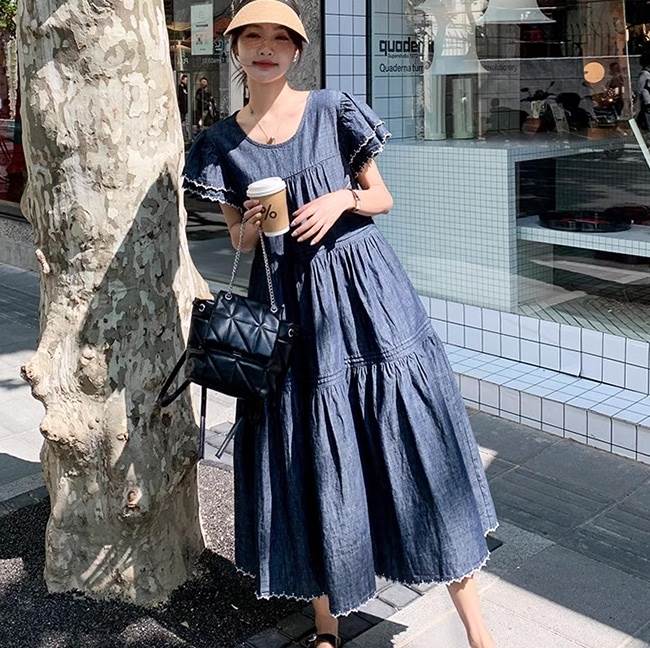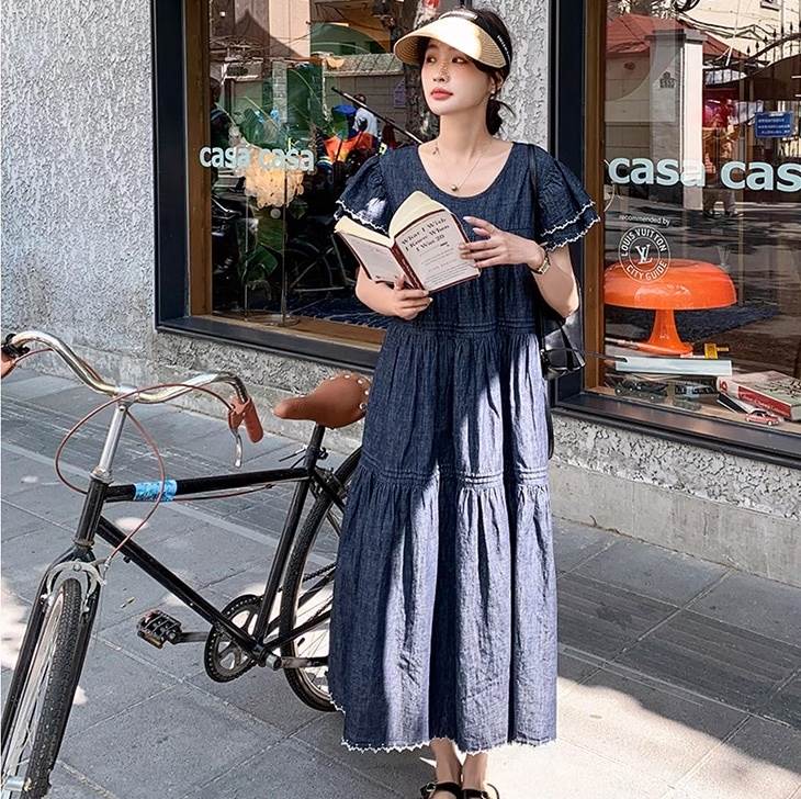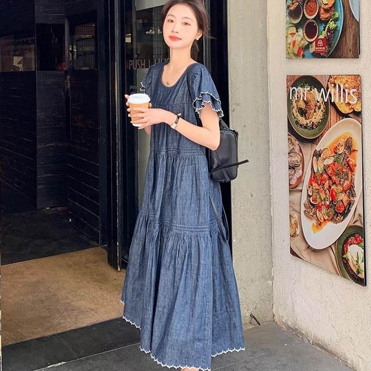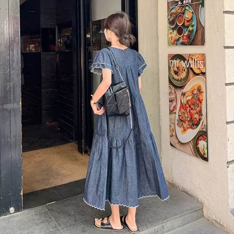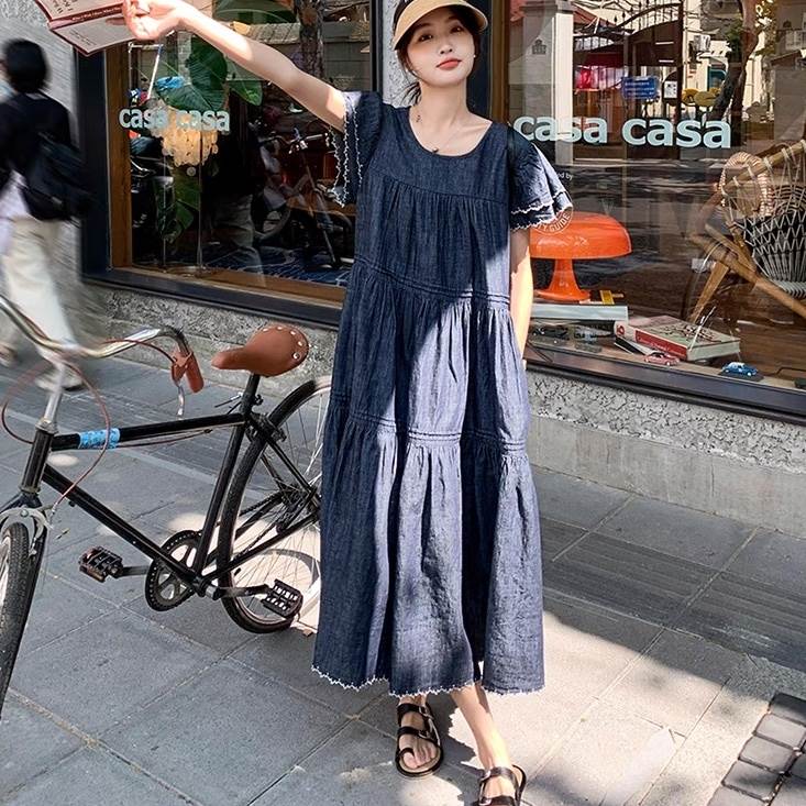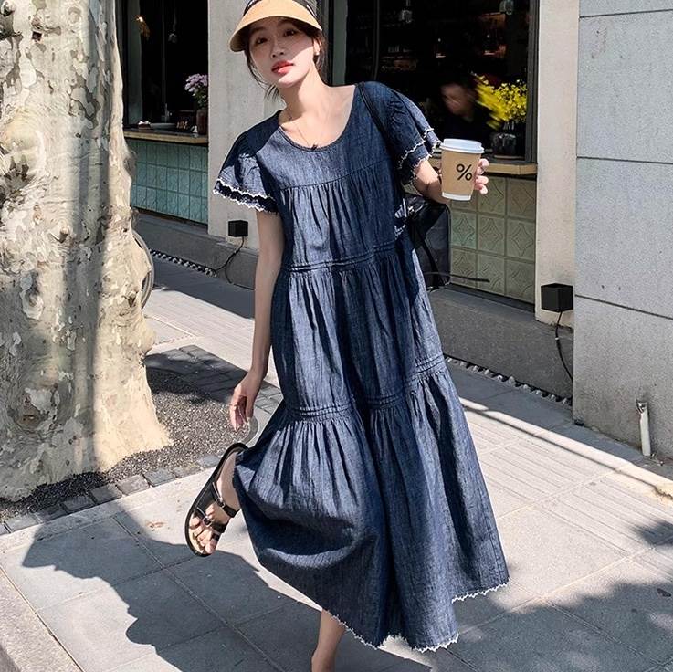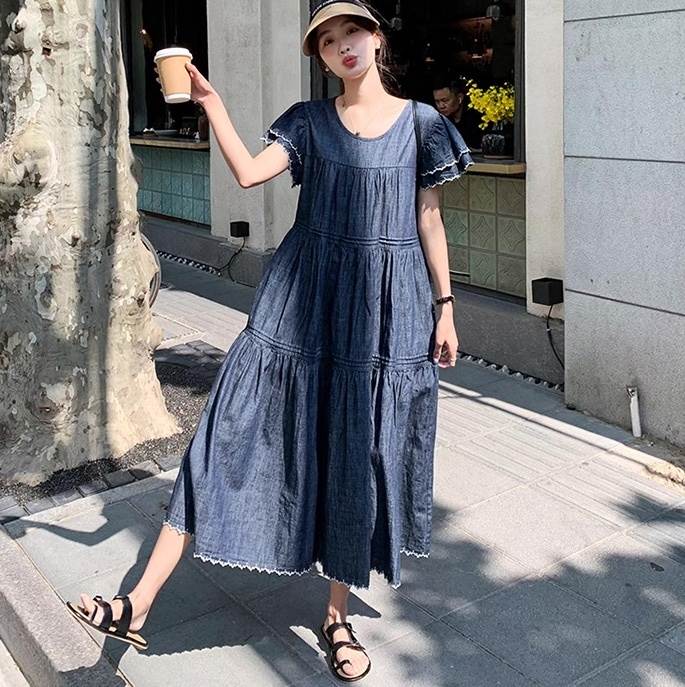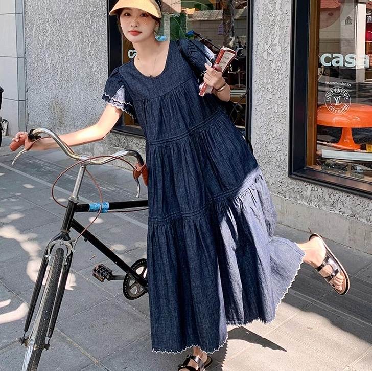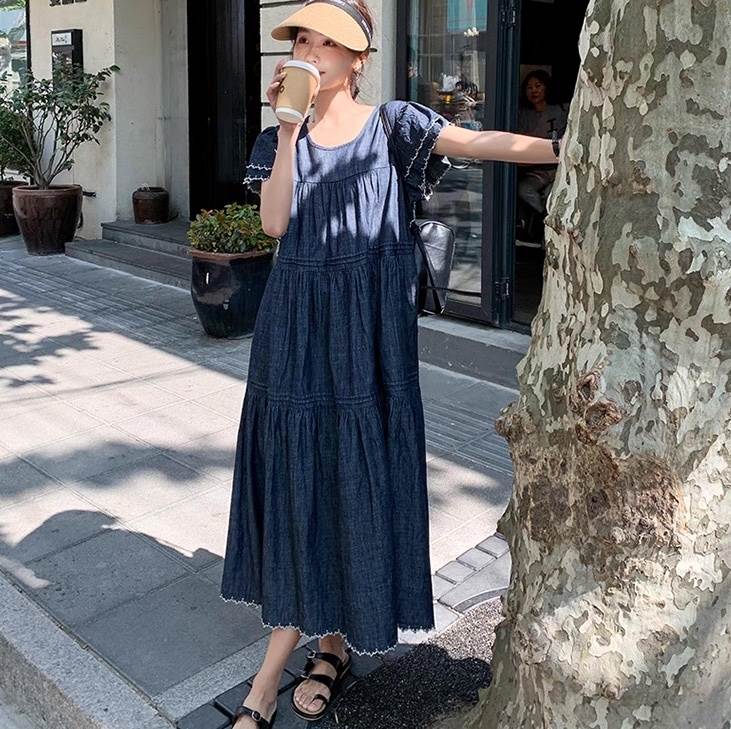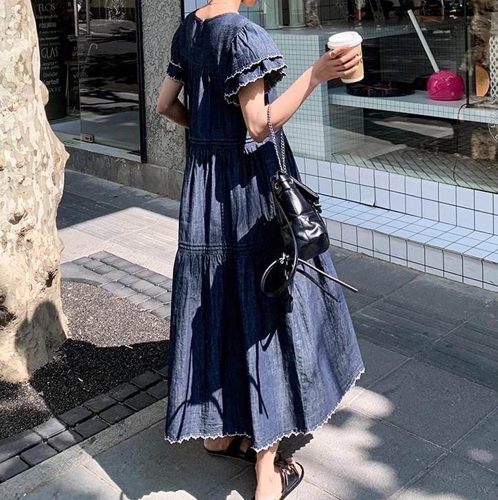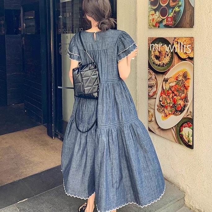 デニム ワンピース ティアード マキシ 半袖 フリル袖 ダブル袖 フレア Aライン フリル ブルーデニム ステッチ かわいい 大人可愛い きれいめ カジュアル おしゃれ かっこいい こなれ感 ガーリー 抜け感 キュート ベーシック アメリカン プレッピー カントリー アクティブ