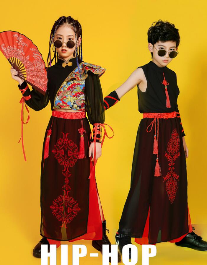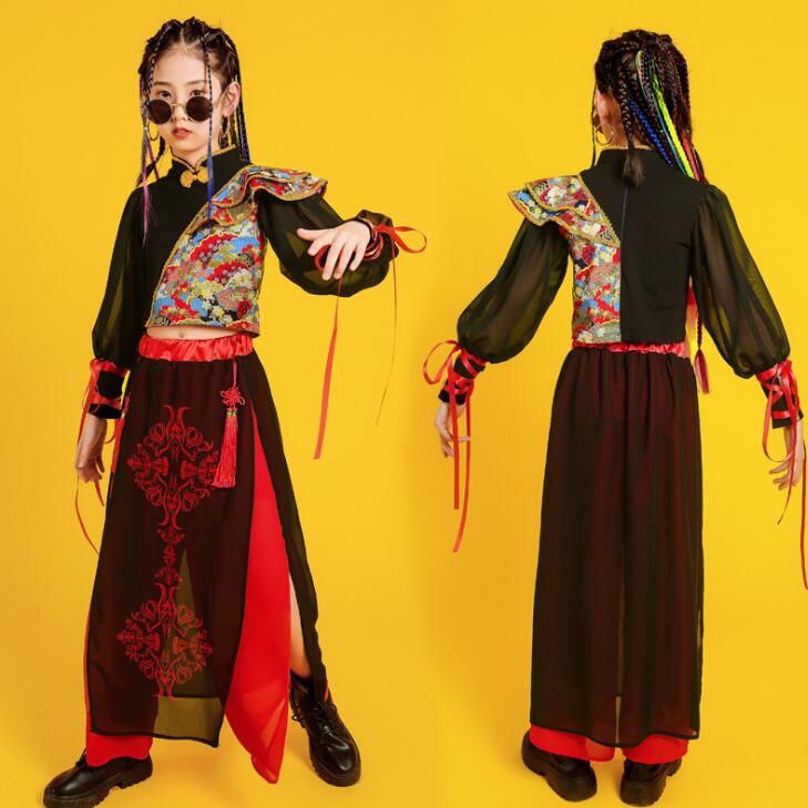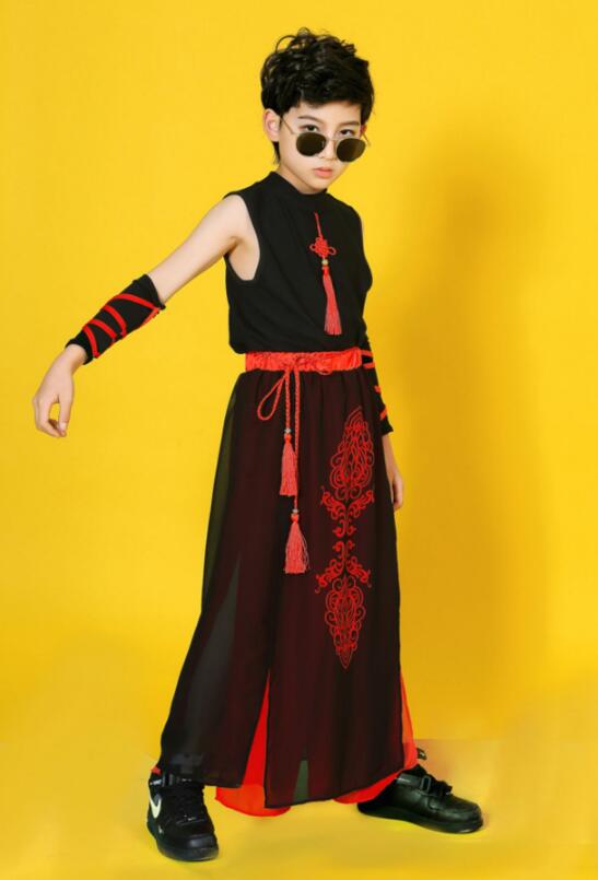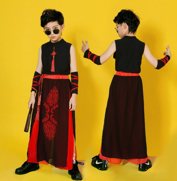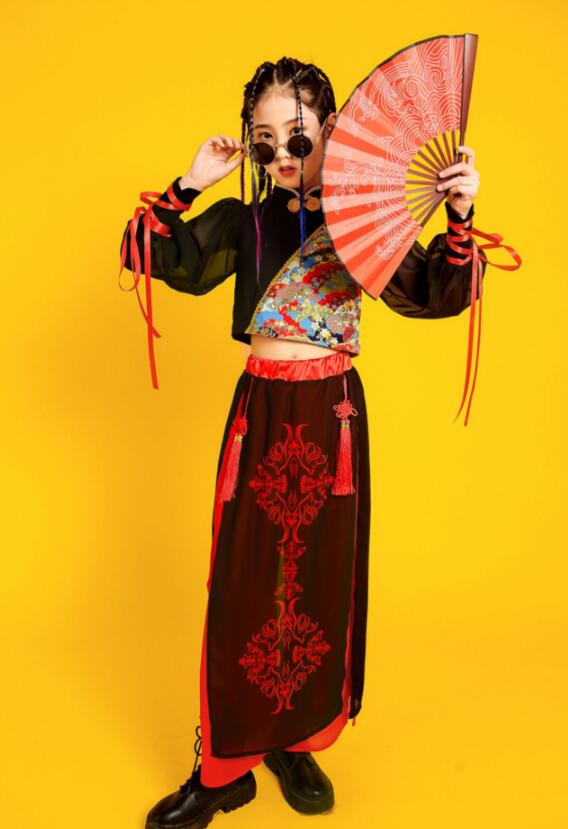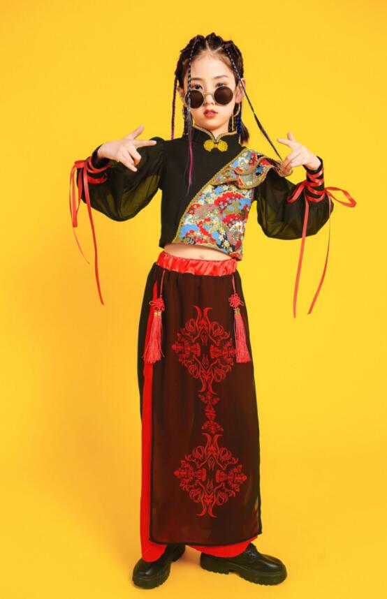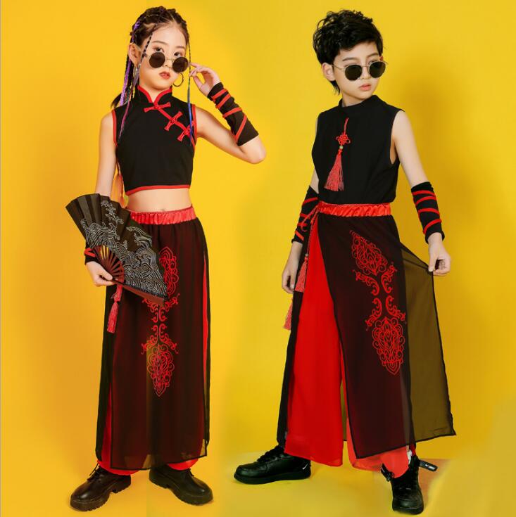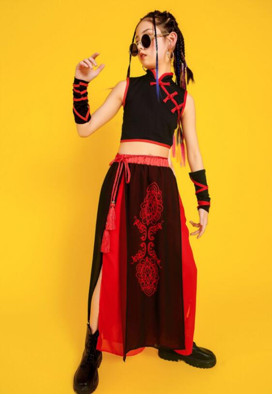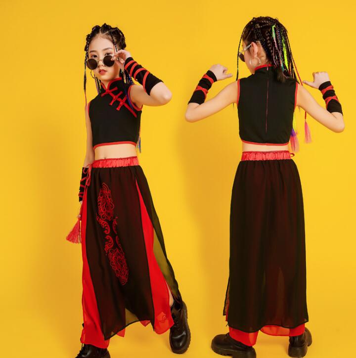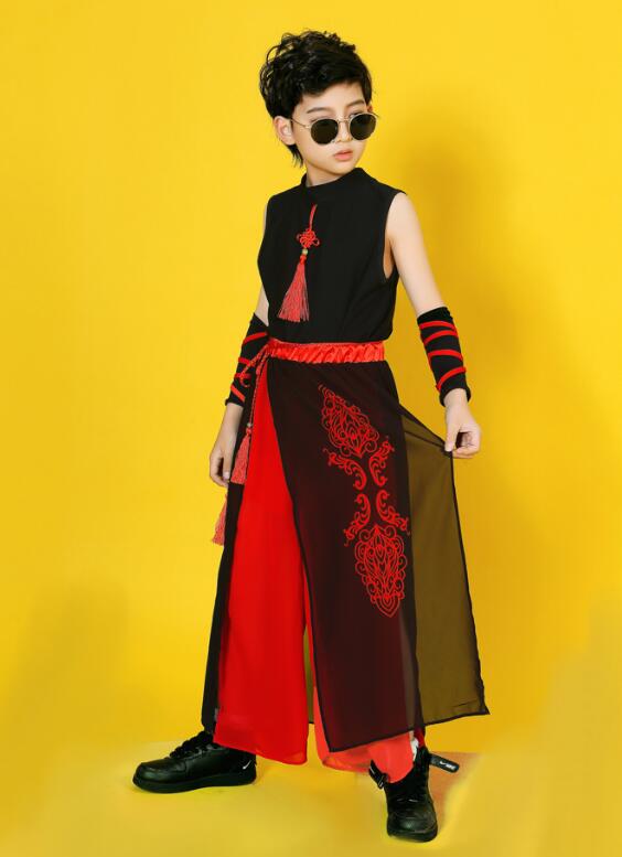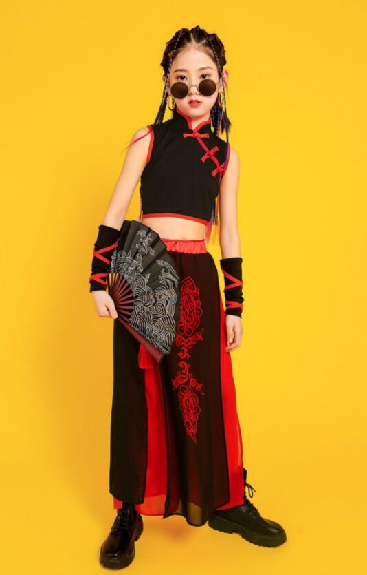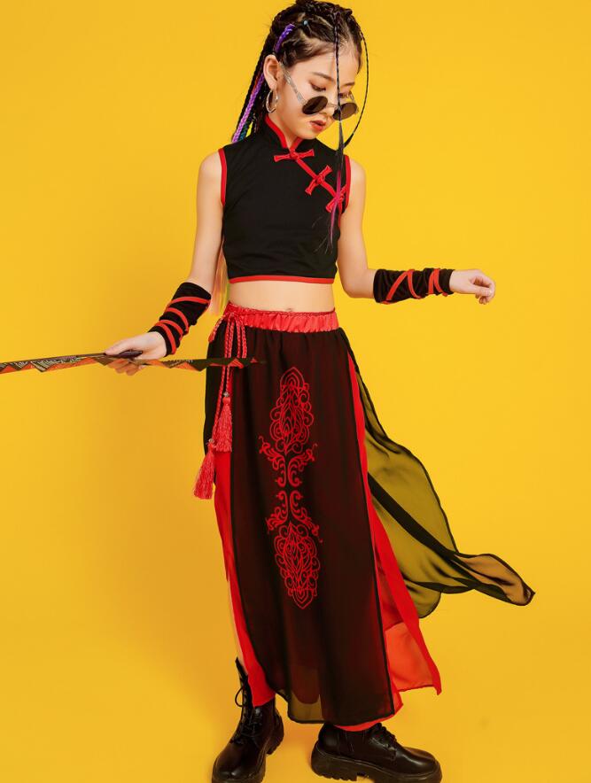 子供ダンス衣装 ステージ衣装 セットアップ 袖なし 長袖 トップス スカート風パンツ チャイナ風 舞台 スリット サルエルシフォンパンツ 袴風 和風 ダンスウェア 男の子 女の子 キッズ ヒップホップ カンフー 武術 表演服 モデルショー 公演服 おしゃれ 中国風 中華服 黒×赤
