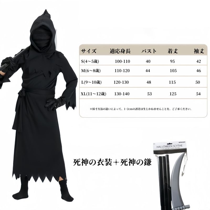 【鎌付き】ハロウィン 子供 コスプレ 死神 無地 黒 子供 黒い死神 イベント ステージ 文化祭 お祭り コスチューム 変身 変装 実物撮影 学園祭 ワンピース ハロウィン仮装 Halloween 演出服 子供用 コスプレ衣装 キッズ
