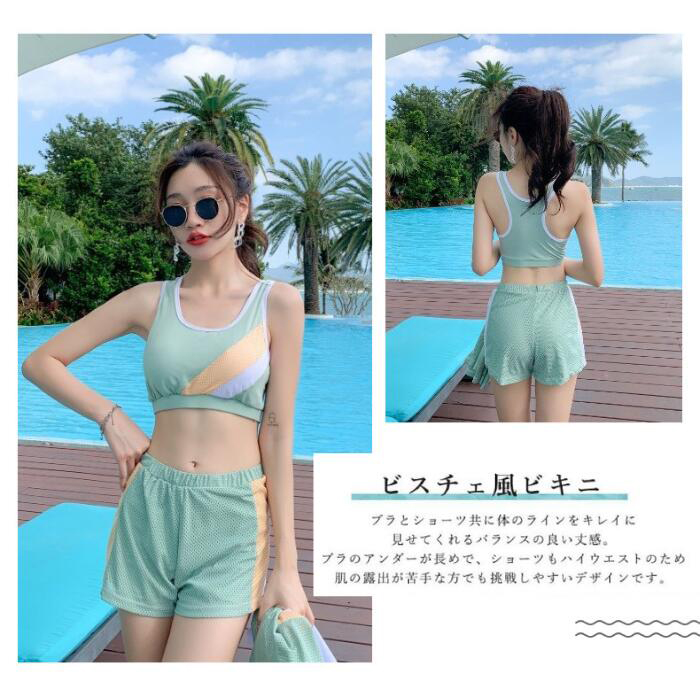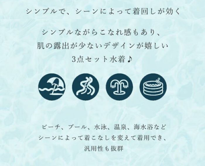 ○ 露出が苦手なあなたでも大丈夫なトップス付水着3点セットです。