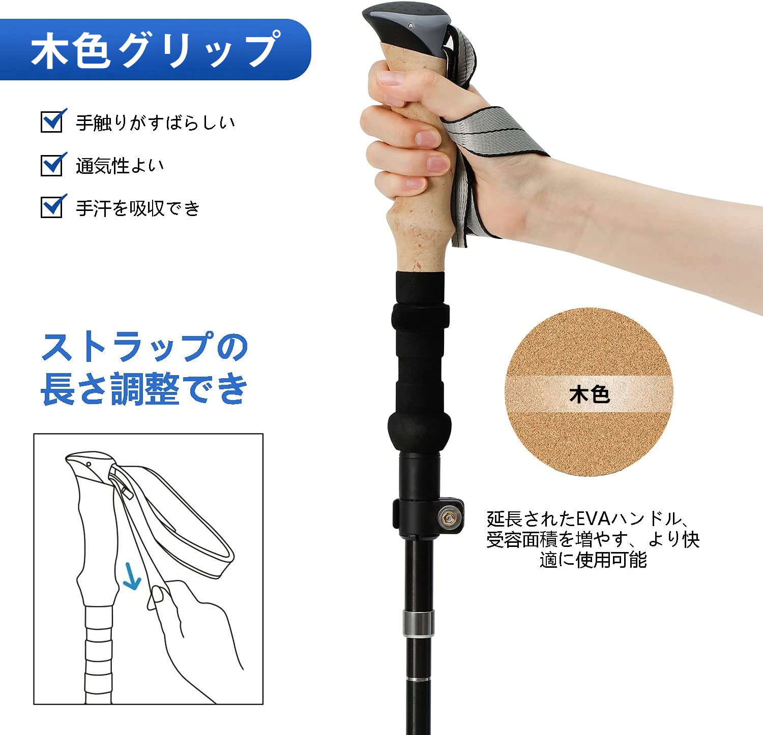 【軽量で持ちやすい】杖1本あたりの重さは約270グラムで、長時間の使用にも非常に軽いです。EVEのスポンジ製ハンドルは手首や手首への負担を軽減し、グリップ部分は湿気を吸収して持ちやすいです。