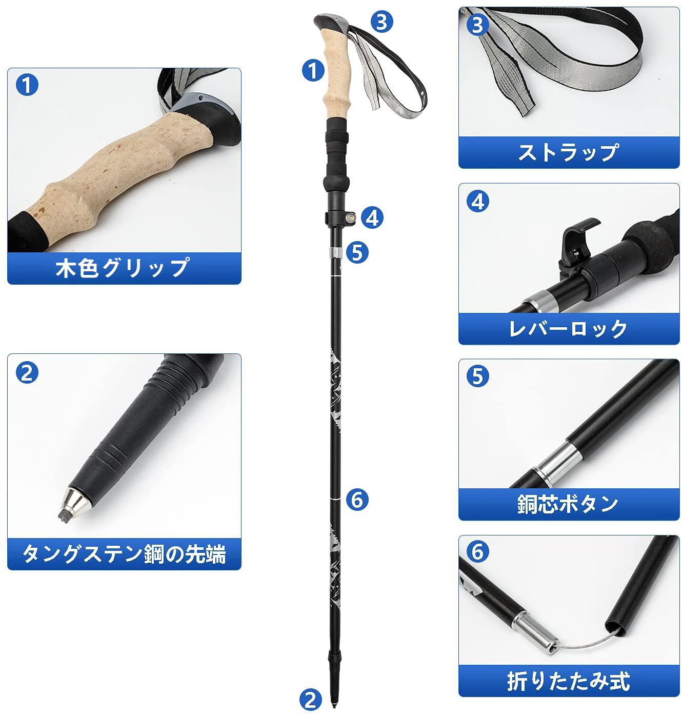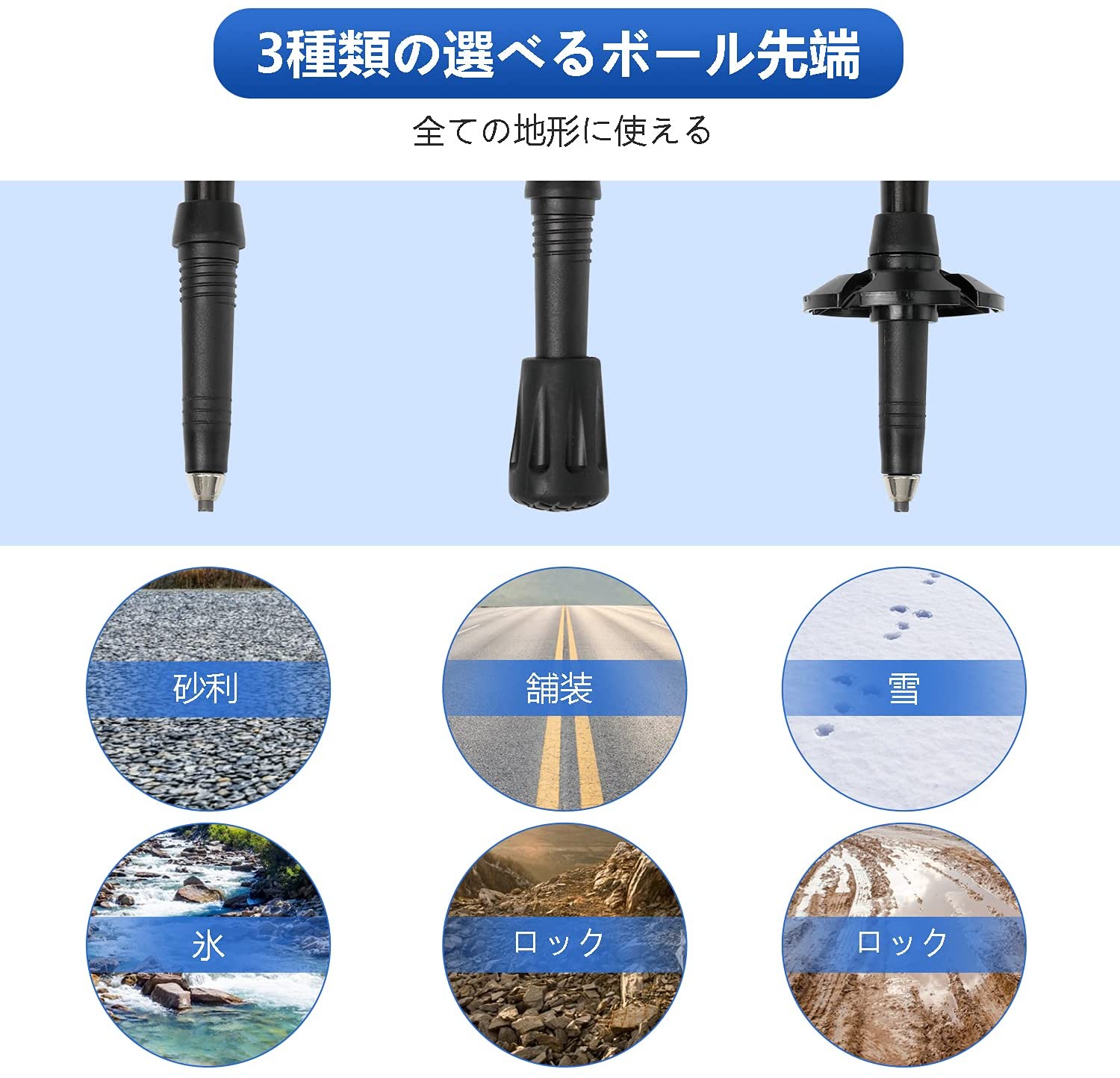 【付属品】トレッキングポールの先端は、高硬度、耐摩耗性、靭性に優れた高品質のタングステン合金を使用しています。さまざまな環境に適した岩、湿地、雪道、アスファルト道路用の取り外し可能なゴムカバーが装備されています。収納バッグ付きで、バッグに入れることができます。