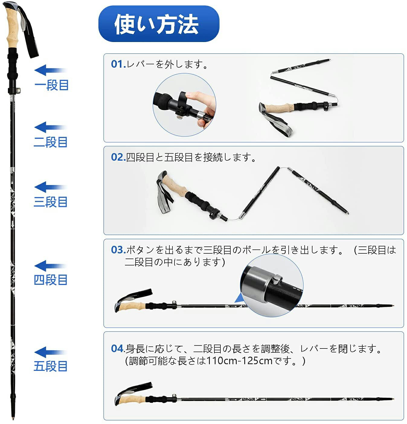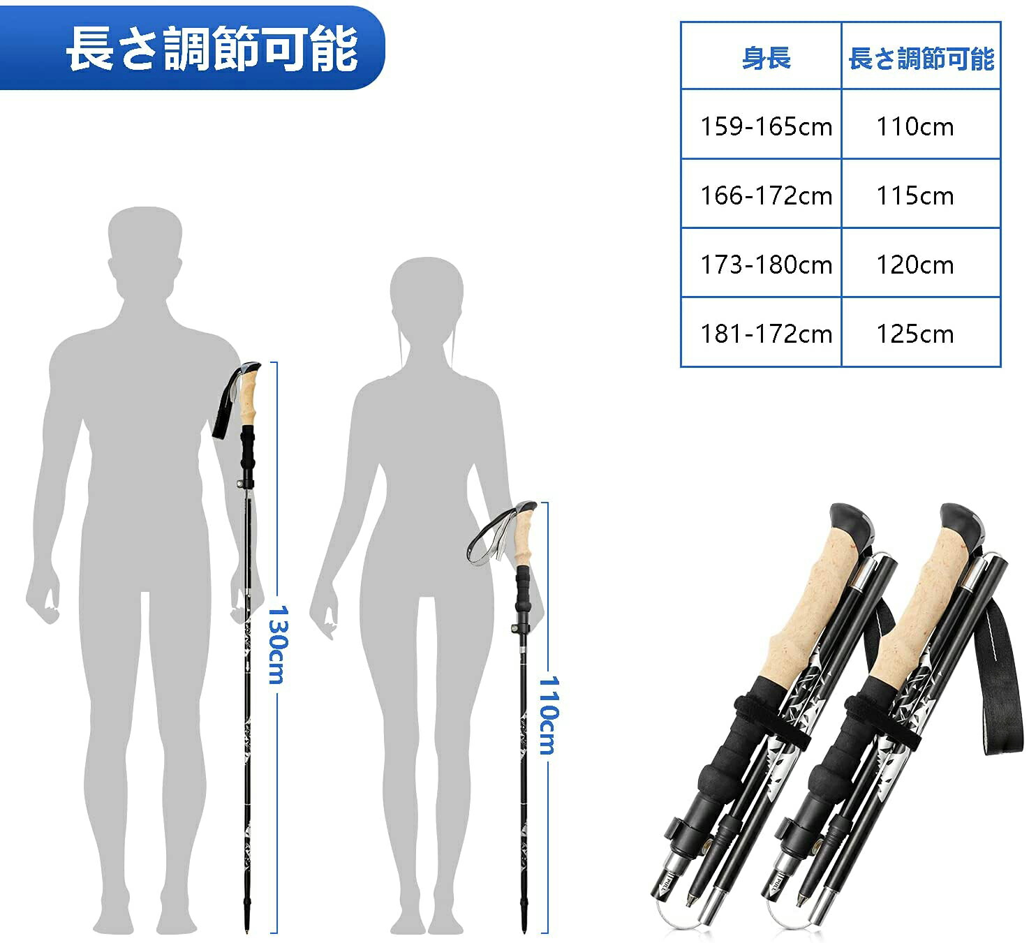 【3段アジャスタブル&アルミ】バックパックに取り付け可能な3段伸縮式トレッキングポール!収納が簡単な3段伸縮式トレッキングポール。収納サイズは34cm、使用サイズは110~125cmです。110CMから125CMに調整することは、アジア人の習慣に適しています。7075アルミ合金よりも硬く、耐熱性、耐食性に優れています。