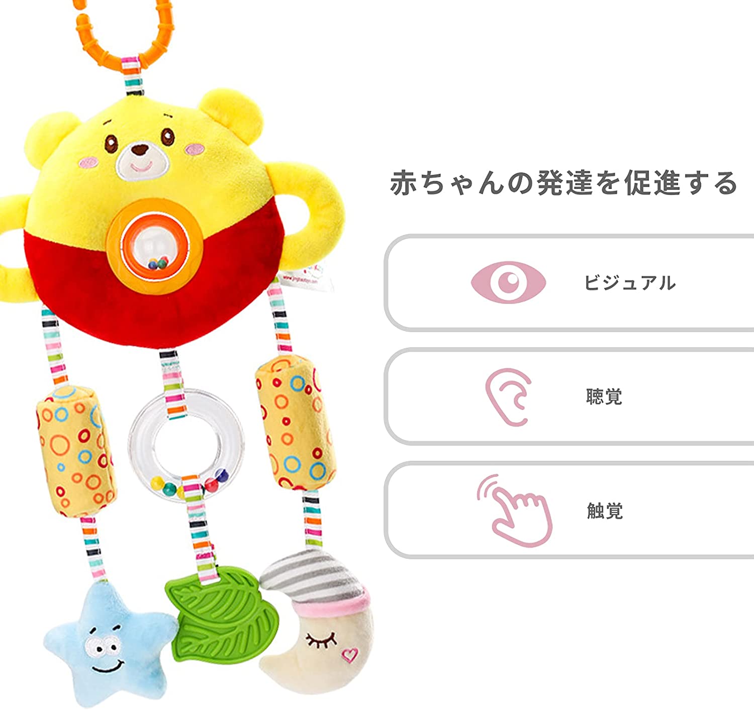 商品情報商品紹介 【赤ちゃんの視力を育てる】明るい色とかわいい動物の形が赤ちゃんの視力を刺激し、赤ちゃんの色彩感覚を育むことができます。