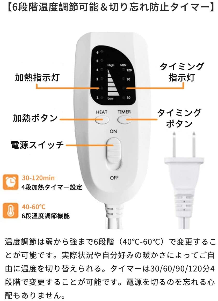 6段階の温度設定可能(40°C~60°C)、お好みの温度を自由に切り替えます。またタイマー機能も搭載し、30分から120分まで四つの時間を設定し、使用簡単が便利です。