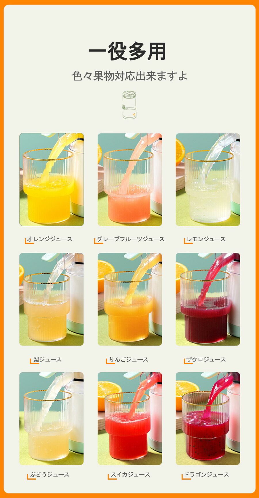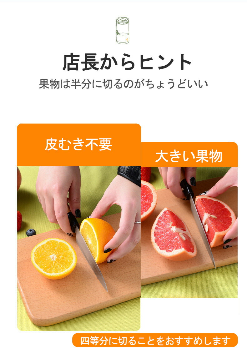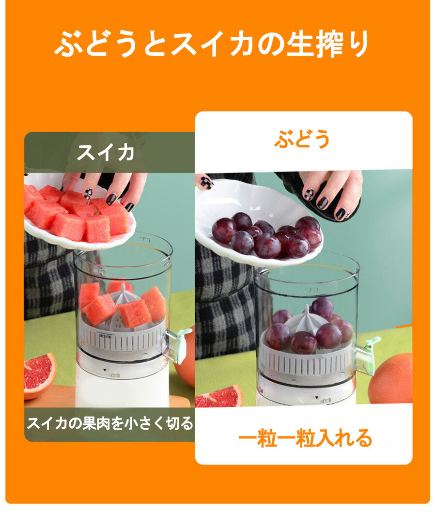 一機多搾り、オレンジ、りんご、ザクロ、スイカ、ブドウなど. 果物は半分に切るだけで、皮をむくことなくジュースを搾ることができます。