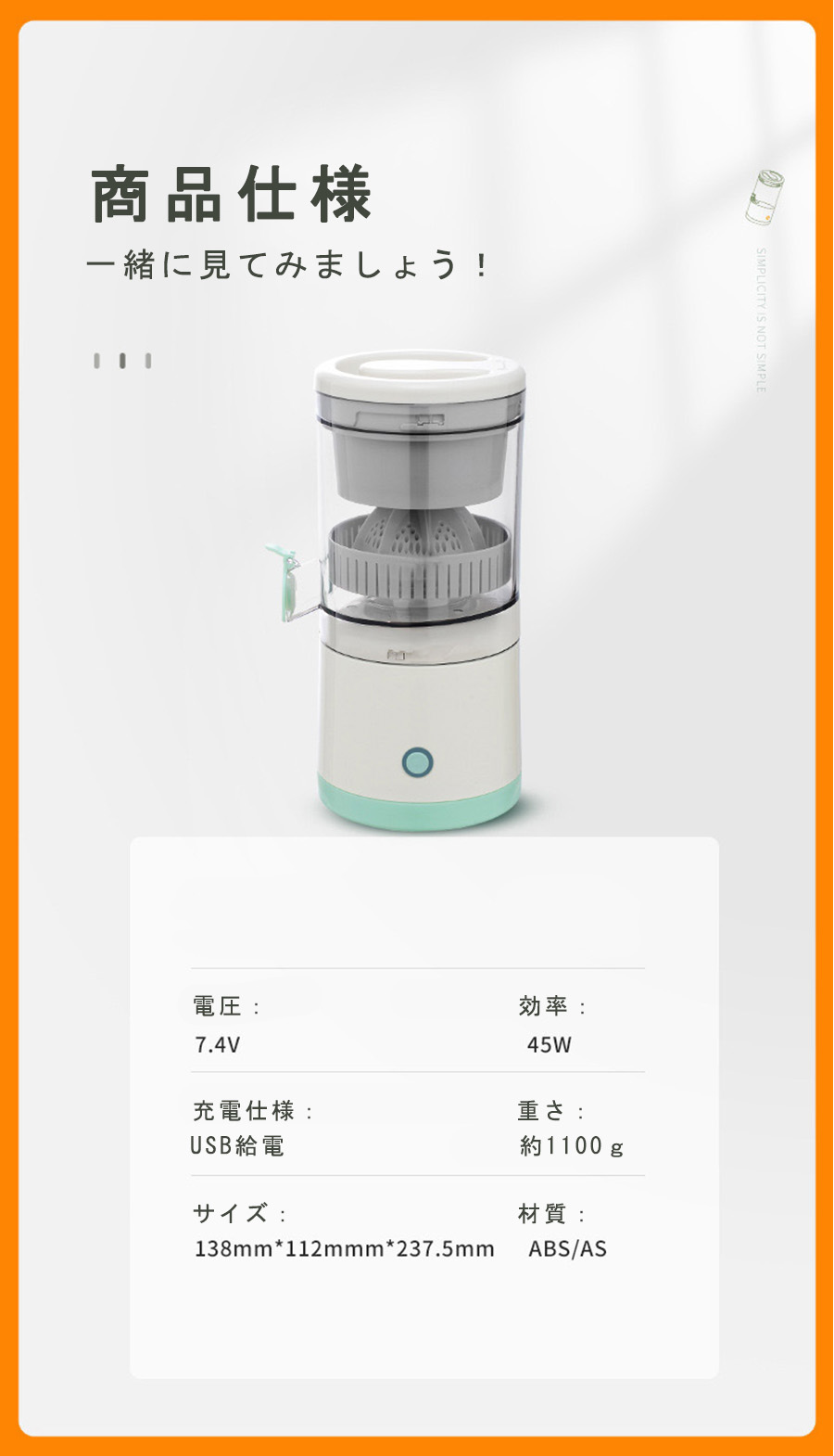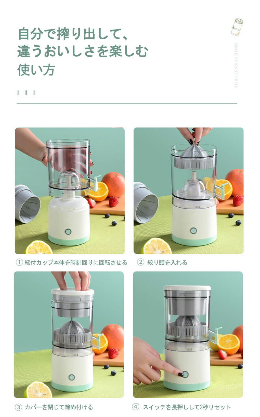 【ワイヤレスデザイン】:電動シトラスジューサーはUSB-Cで充電できるので、バッテリー切れを気にせずにコードレスシトラスジューサーを屋外キャンプに持っていくと、いつでもどこでも美味しいジュースが楽しめます!