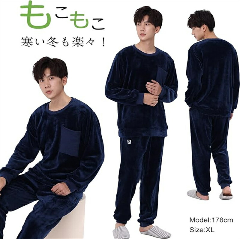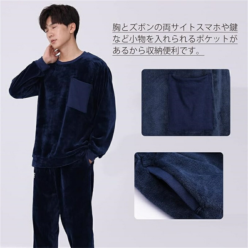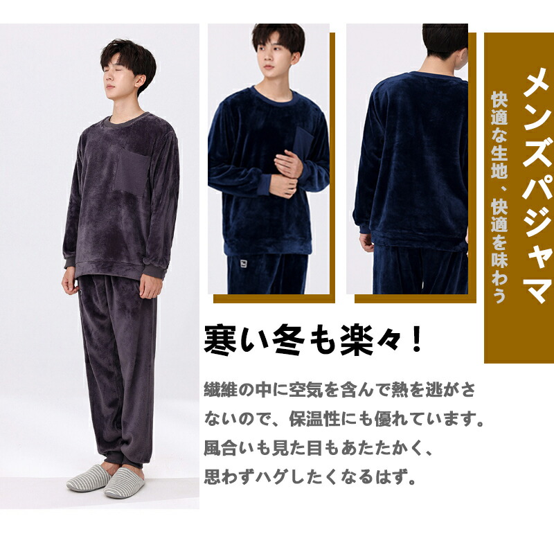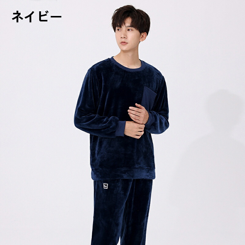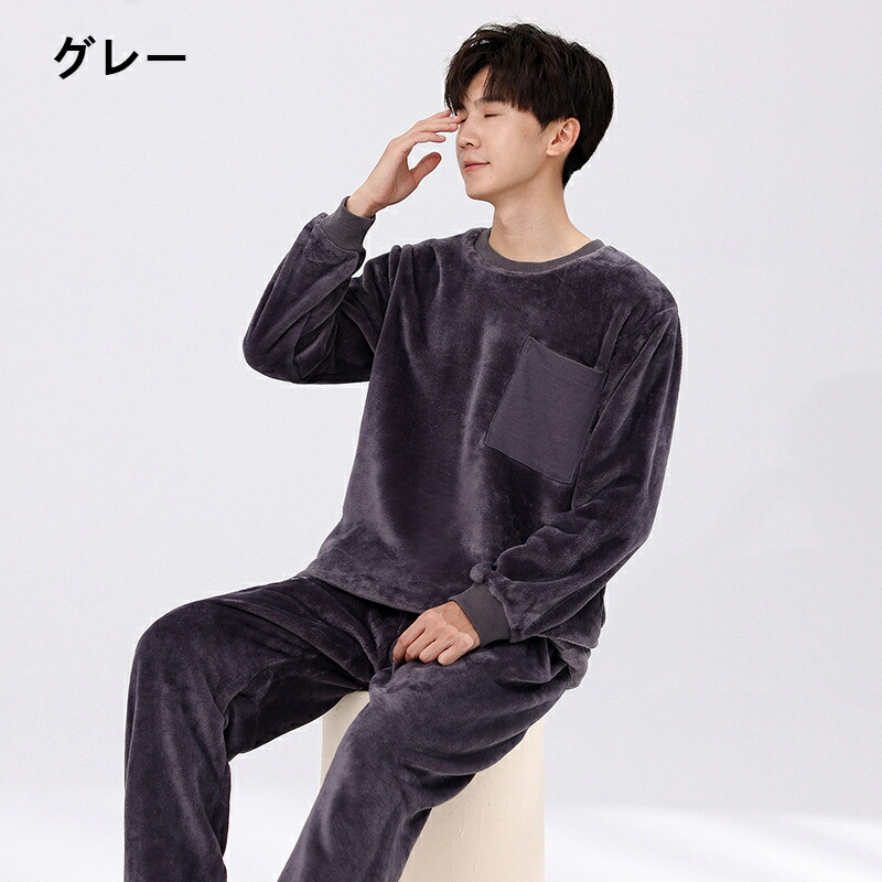 パジャマ メンズ ルームウェア もこもこ 冬 上下セット 裏起毛 暖かい 保温 防寒 ふわふわ フランネル 無地 厚手 ホームウェア 室内着 部屋着
