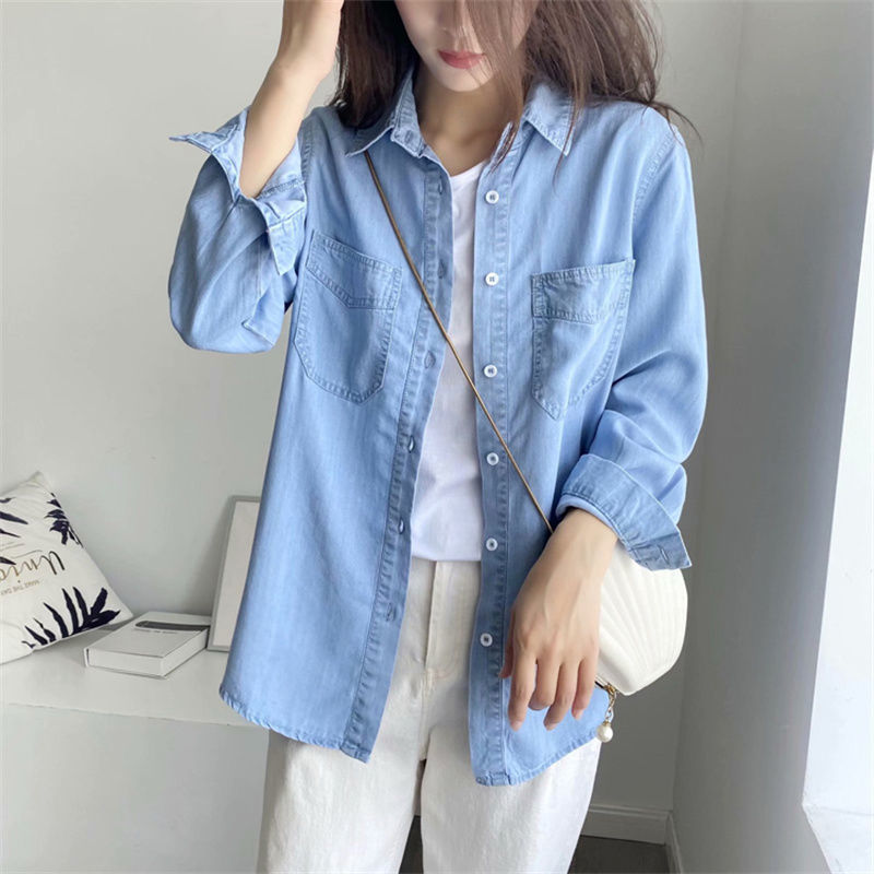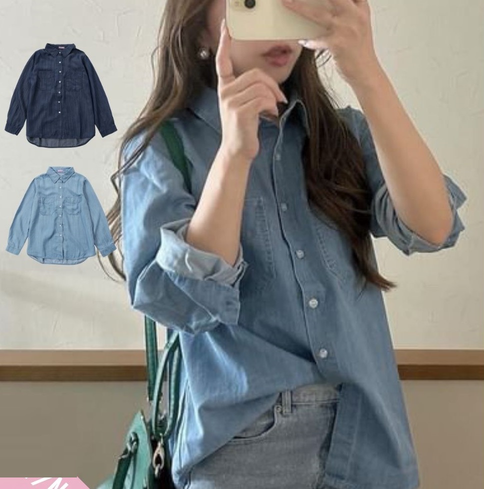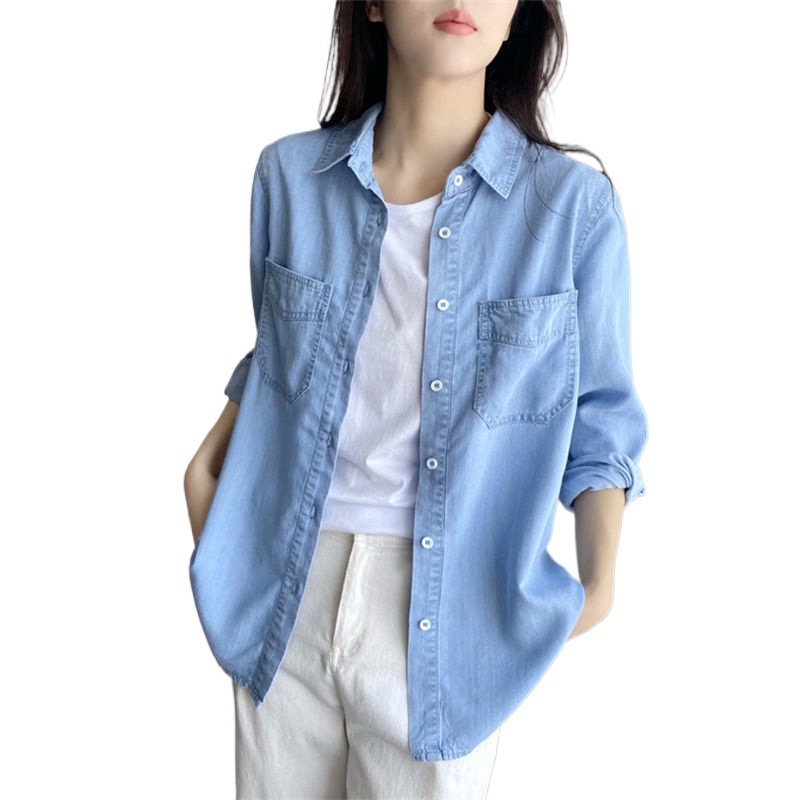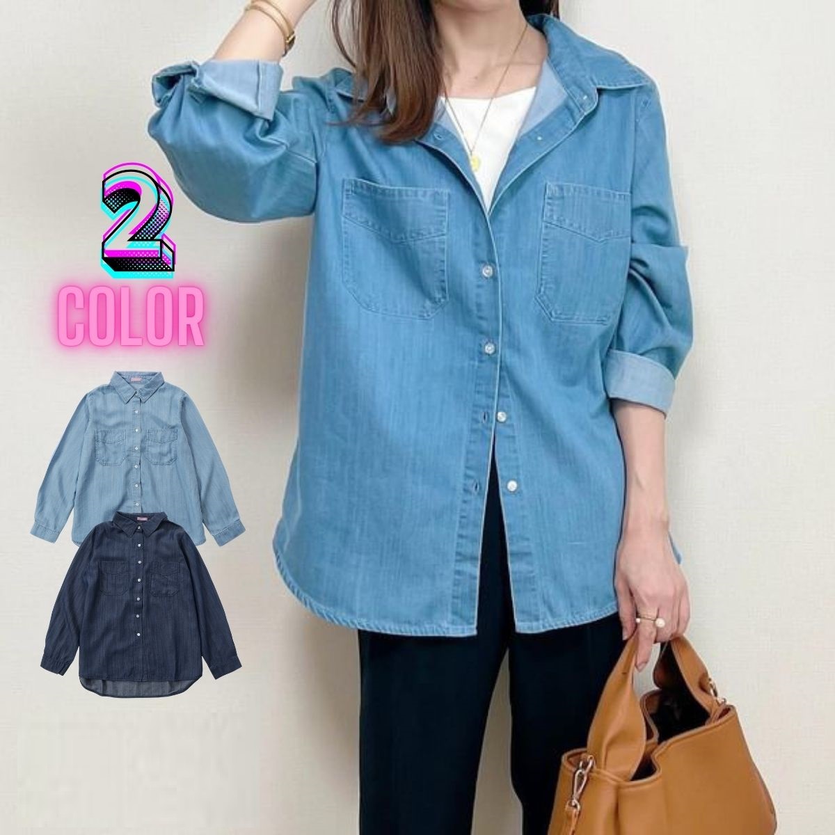 長袖 デニム シャツ デニムシャツ レディース ダンガリーシャツ 羽織り ブラウス ダンガリー おしゃれ かっこいい 韓国ファッション 襟付き ボタンシャツ 前開き 韓国 ブランド 20代 30代 40代 50代 大きいサイズ 春 秋 シンプル ブルー サックス