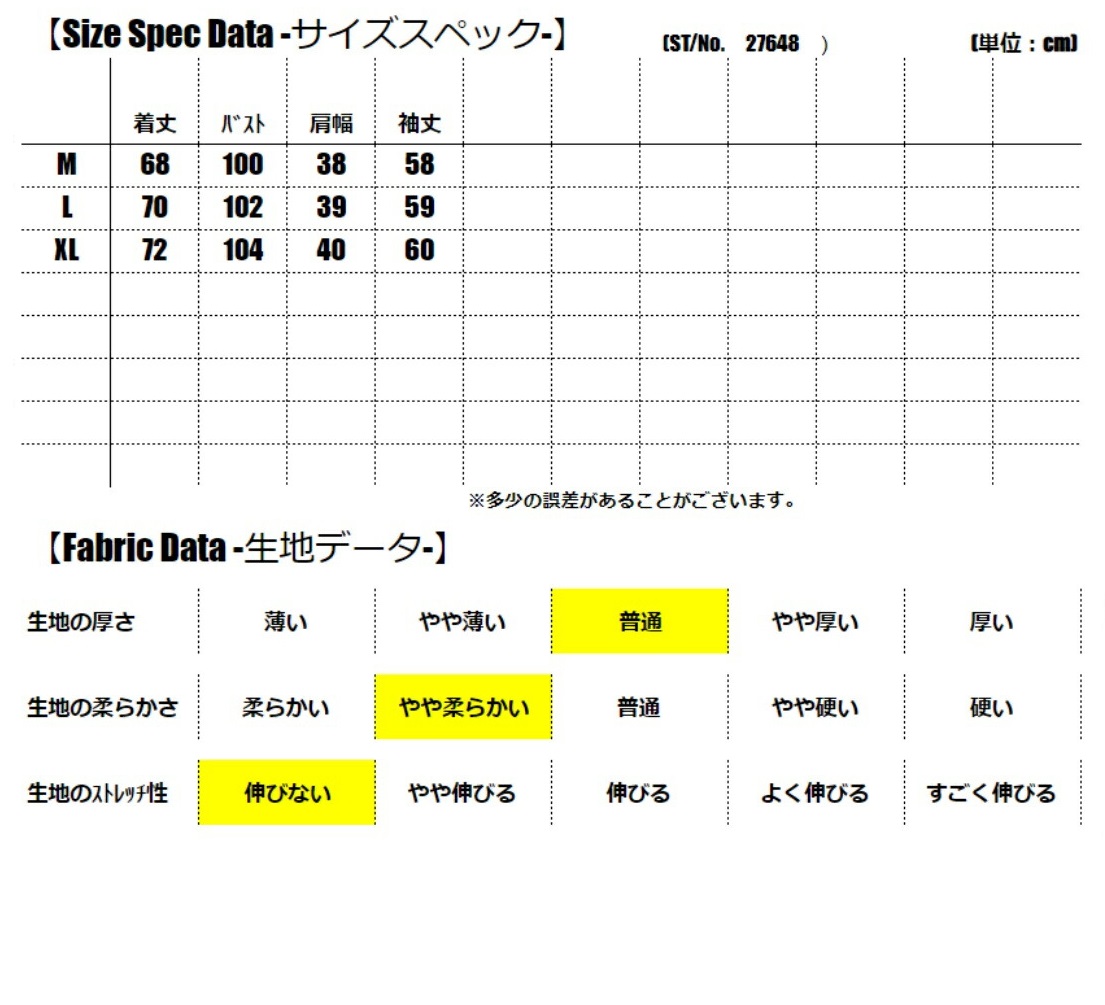 【M】:着丈68 バスト100 肩幅38 袖丈58