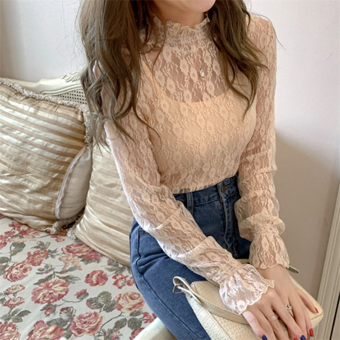長袖 フリル ハイネック レース Tシャツ シースルー シアー トップス シャツ 重ね着 レディース ロンT 韓国ファッション セクシー シアーシャツ おしゃれ 大人 可愛い かわいい 上品 シンプル 透け感 インナー 肌見せ 小花 柄 きれいめ 黒 白 アイボリー