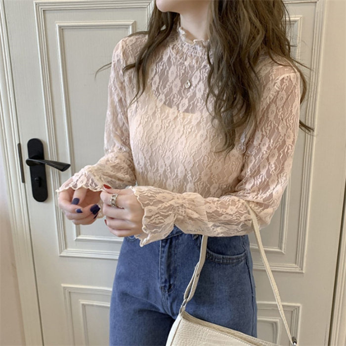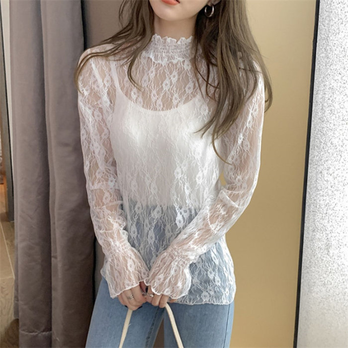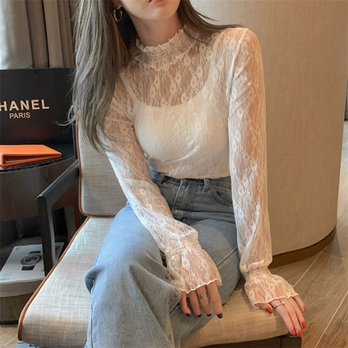 長袖 フリル ハイネック レース Tシャツ シースルー シアー トップス シャツ 重ね着 レディース ロンT 韓国ファッション セクシー シアーシャツ おしゃれ 大人 可愛い かわいい 上品 シンプル 透け感 インナー 肌見せ 小花 柄 きれいめ 黒 白 アイボリー20代 30代 40代 50代 春夏 春服 夏服
