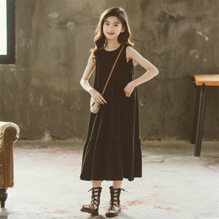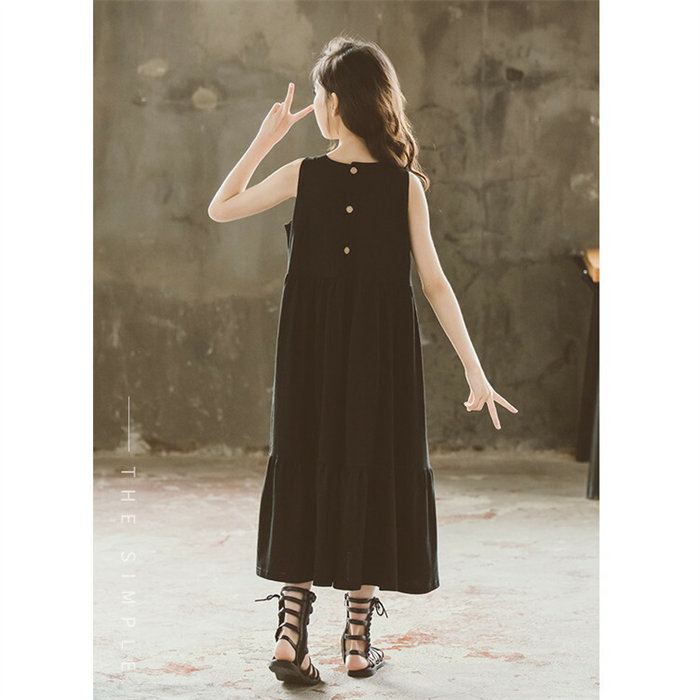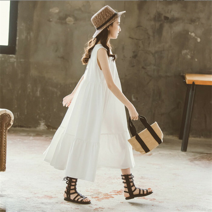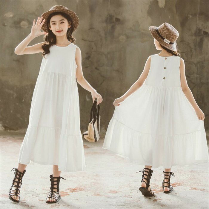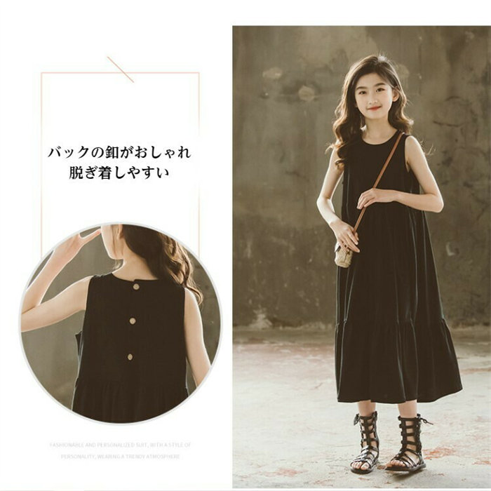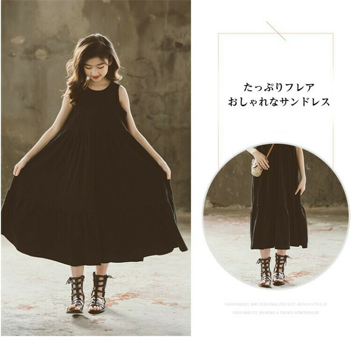 ロング ワンピース 女の子 フレアワンピース ノースリーブ 上品 黒 ホワイト ブラック 白色 Aライン ゆったり サンドレス 子供服 キッズ コットン 棉 夏 春 パーティー 120 130 140 150 160 165cm