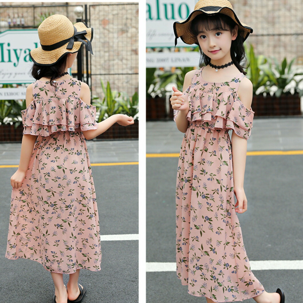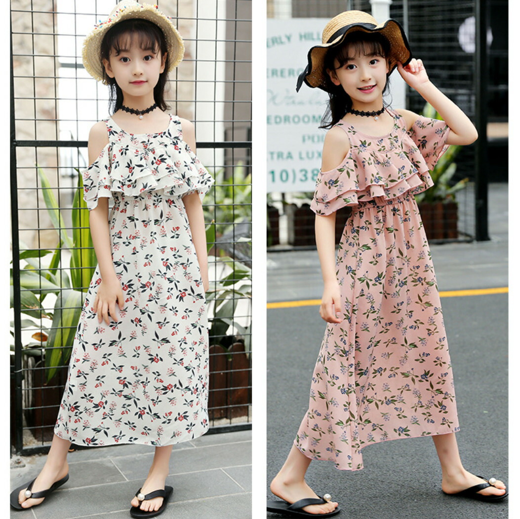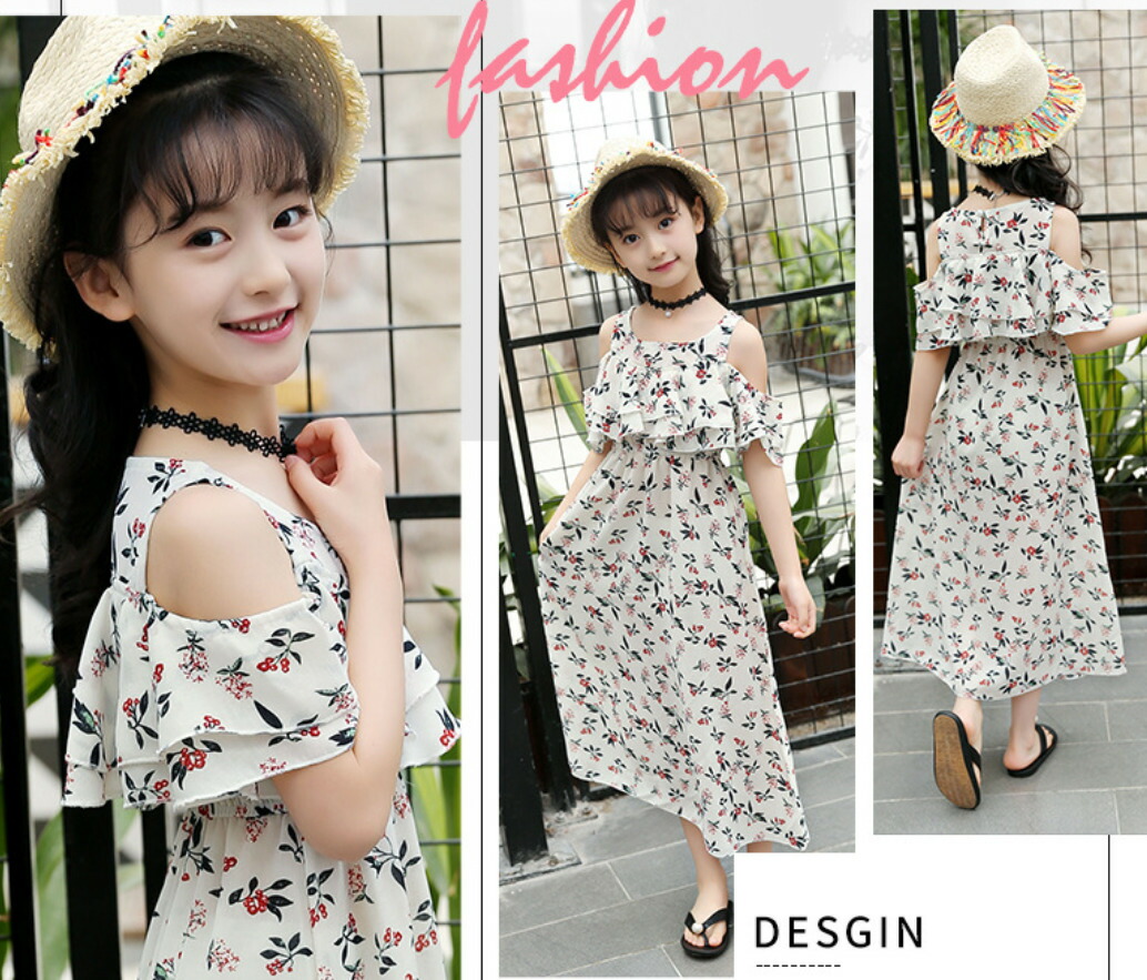 ワンピース オフショルダー ロングワンピース 子供服 女の子 上品 キッズ キャミワンピース 肩出し 花柄 夏 海 シフォン素材 フリル 120cm 130cm 140cm 150cm 160cm