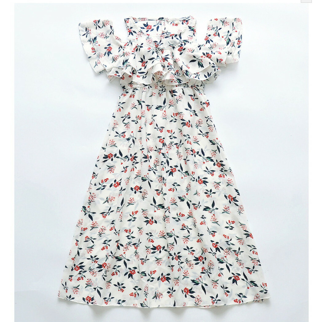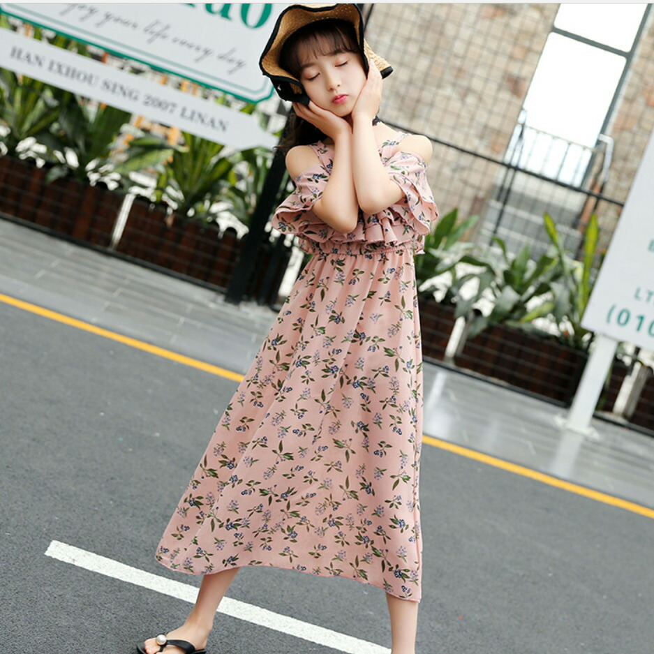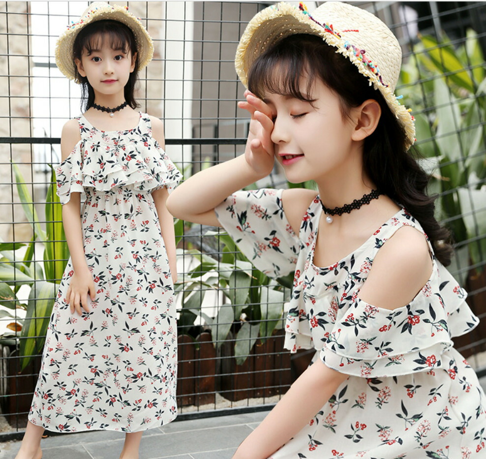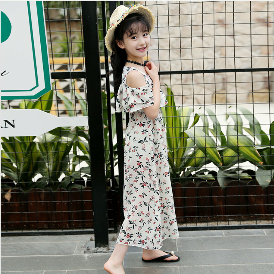 ワンピース オフショルダー ロングワンピース 子供服 女の子 上品 キッズ キャミワンピース 肩出し 花柄 夏 海 シフォン素材 フリル 120cm 130cm 140cm 150cm 160cm