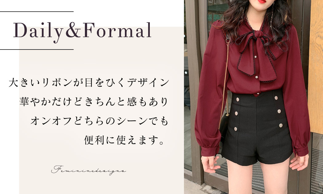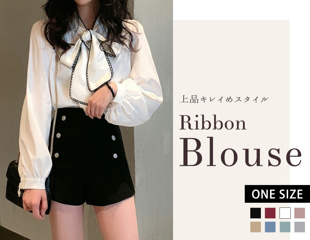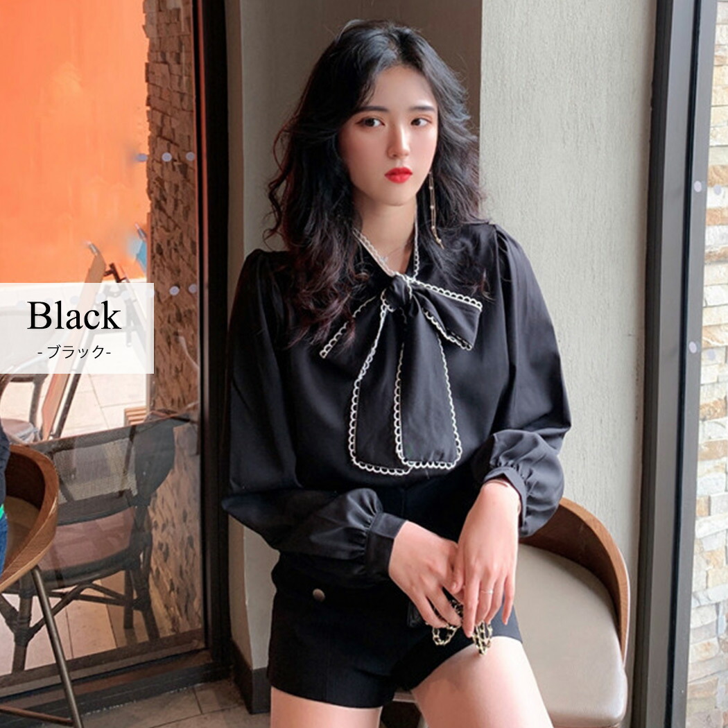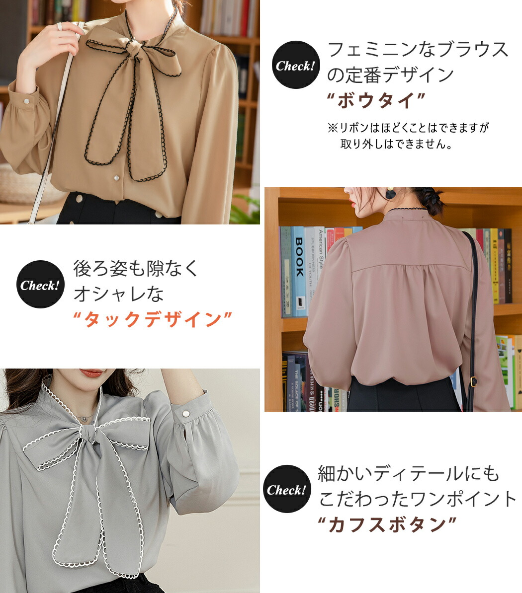 ボウタイ リボン ブラウス レディース 大人可愛い 春 秋 長そで おしゃれ 上品 きれいめ ゆったり 薄手 無地 シンプル フォーマル フェミニン ガーリー 黒 バルーン袖 バック タック 通勤 通学 ビジネス スーツインナー デート