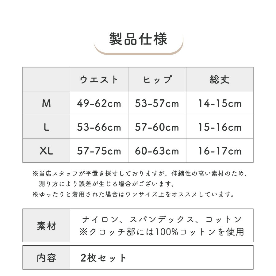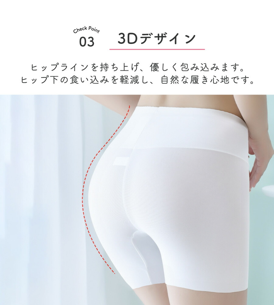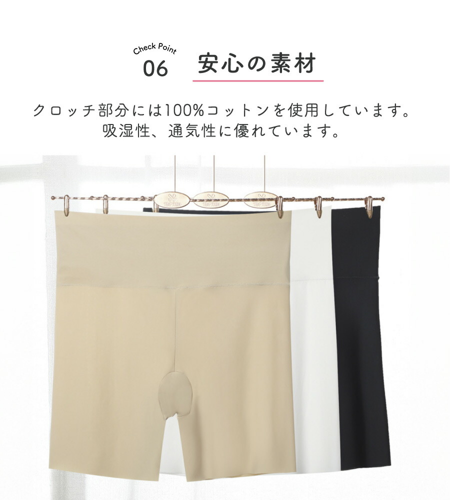 のぼり階段、屈んだ時、薄着の季節などのチラ見せを防ぎます。 薄手のボトムスの下に、ミニスカートの下に、パンティーラインの透け防止に。