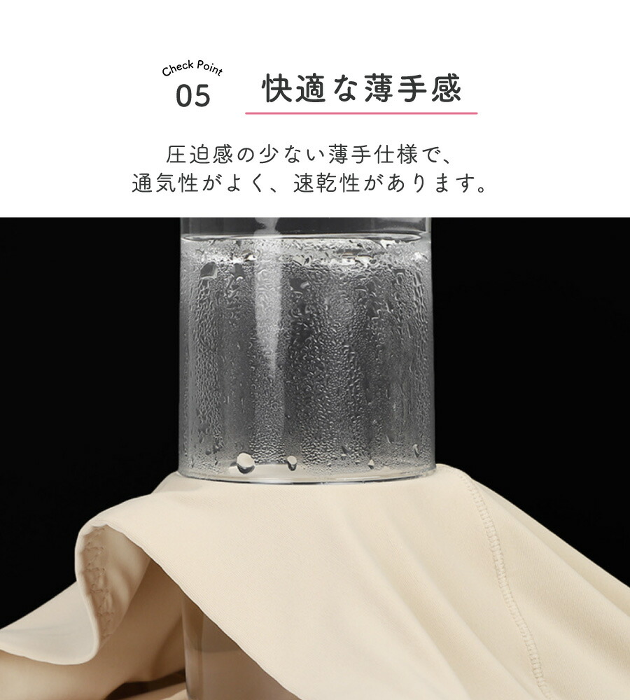 圧迫感の少ない薄手仕様で、通気性がよく、速乾性があります。
