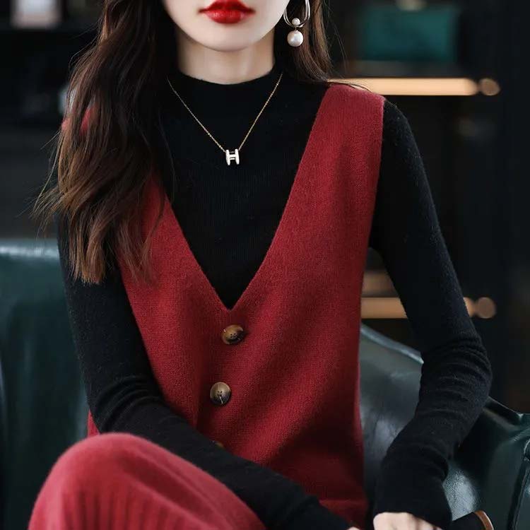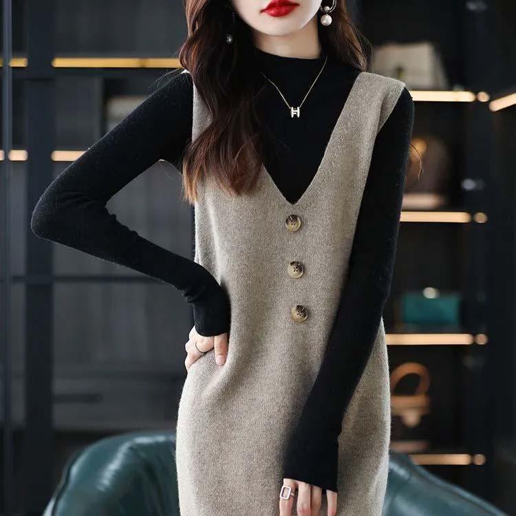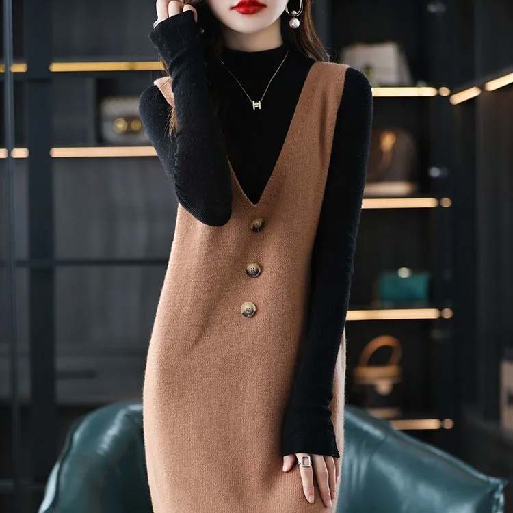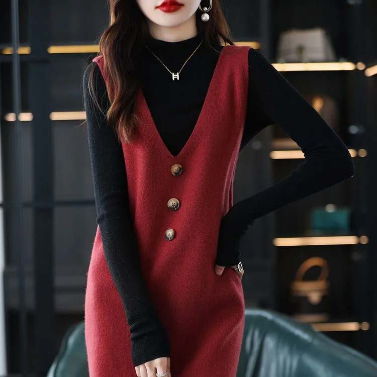 ジャンパースカート ロング丈 秋 冬 春 vネック ニット ワンピース 30代 40代 50代 ノースリーブ ニットベスト レイヤード