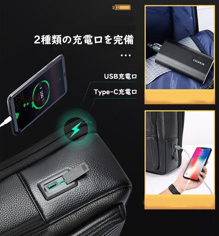 2種類の充電口を完備、外出先で携帯の電池が残り少なくなってしまった時、サイドポケットには充電用のUSBポートが着いているので、充電ケーブルをUSBポートに差し込むだけですぐに充電できます。