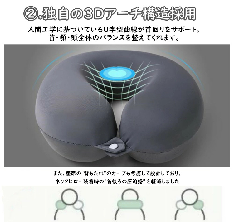 ネックピローは、首を支える形状になっており、首が左右に揺れたり、前後に動いたりしないようになっています。これにより、首や肩の負担を軽減するだけでなく、安定した姿勢を保つことができます。
