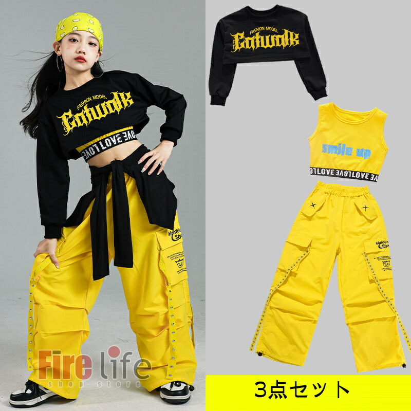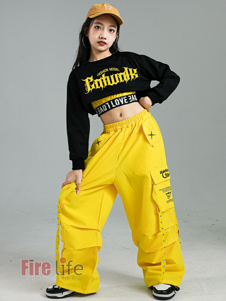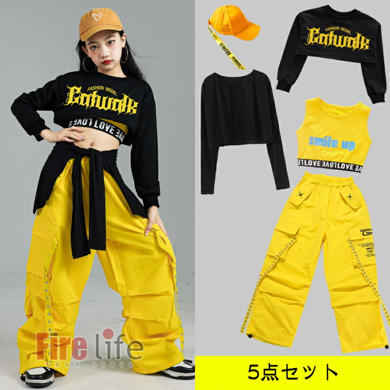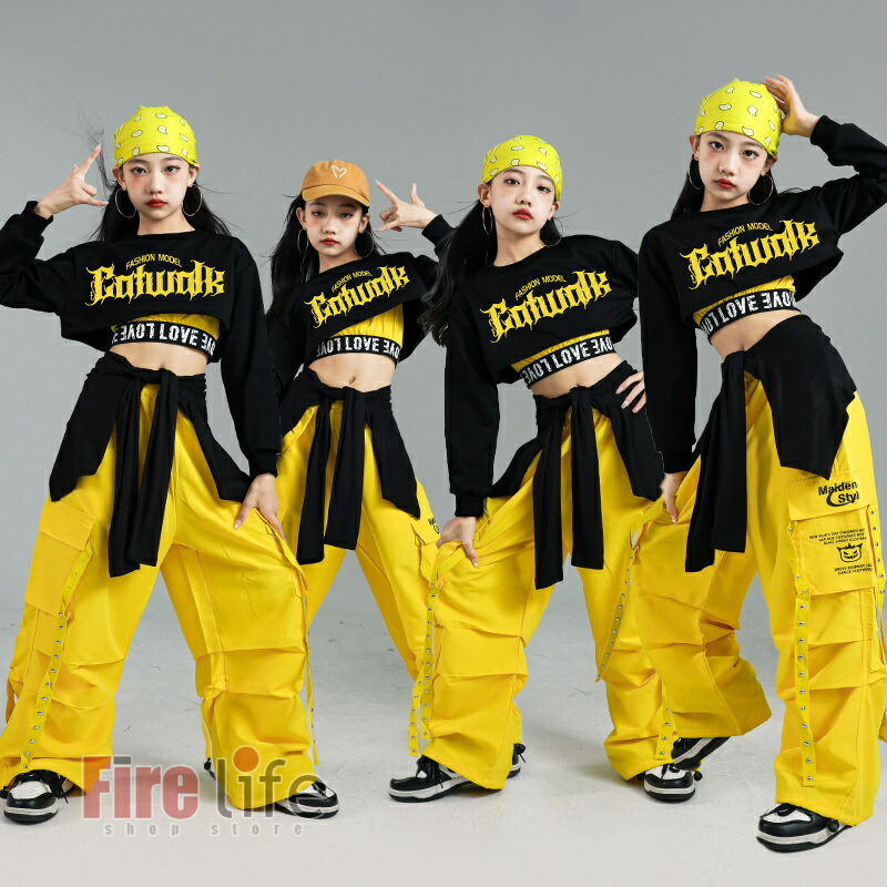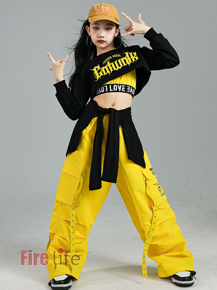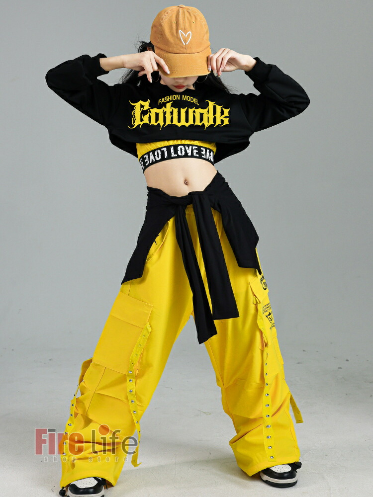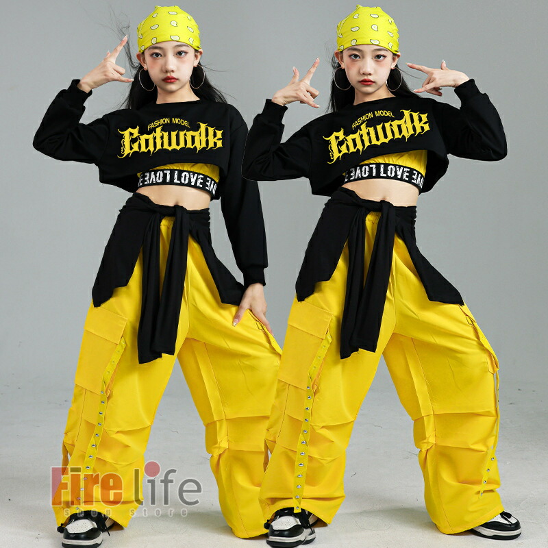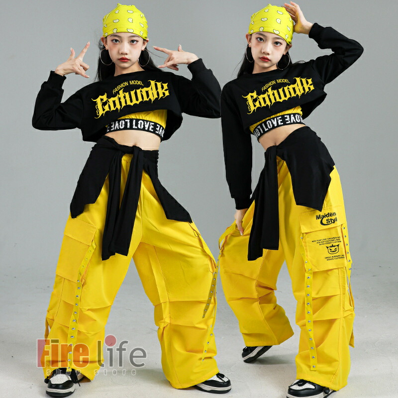 韓国 おしゃれ キッズダンス衣装 ジャズ ヒップホップ ジュニア 子供 女の子 セットアップ へそ出し イエロー ブラック コスチューム hiphop K-pop