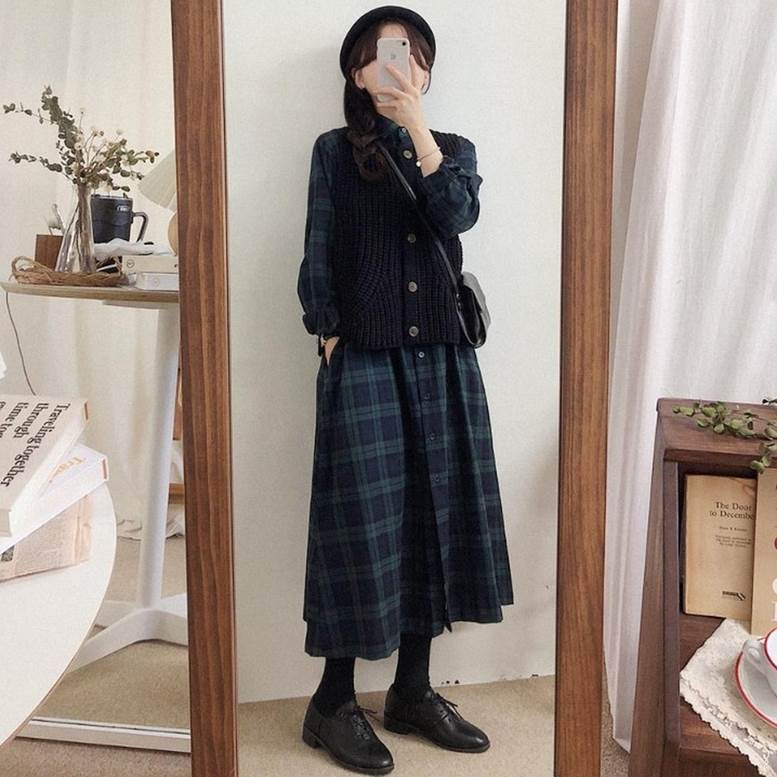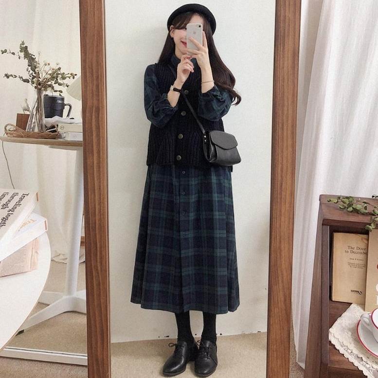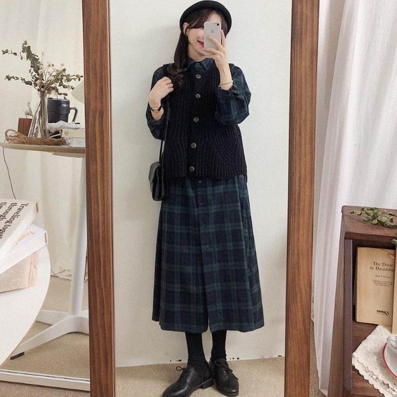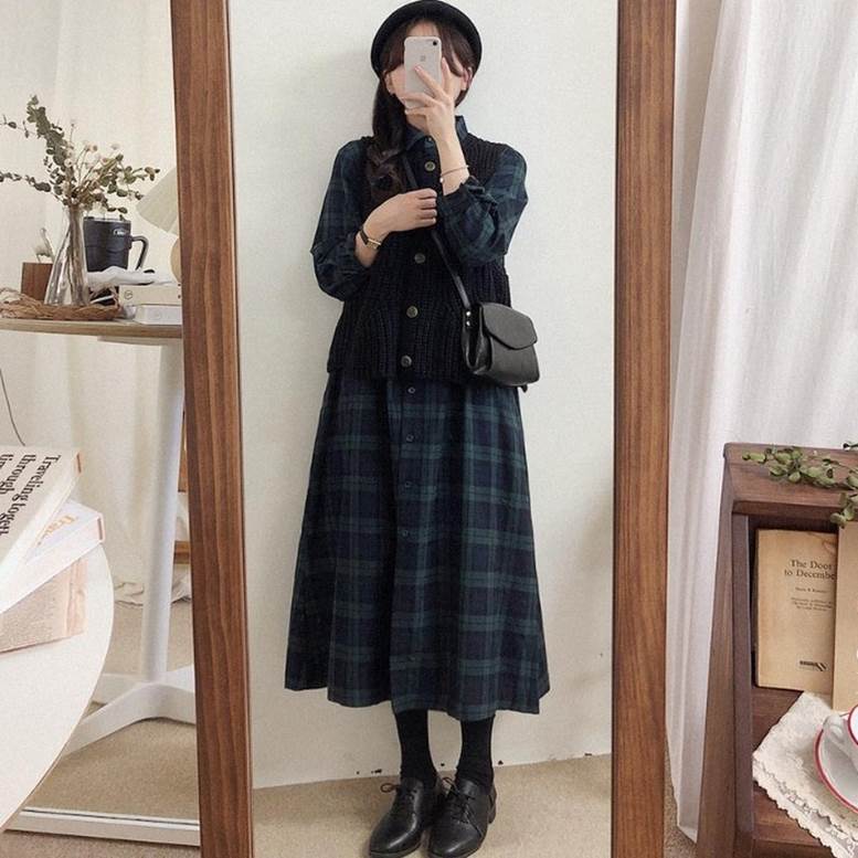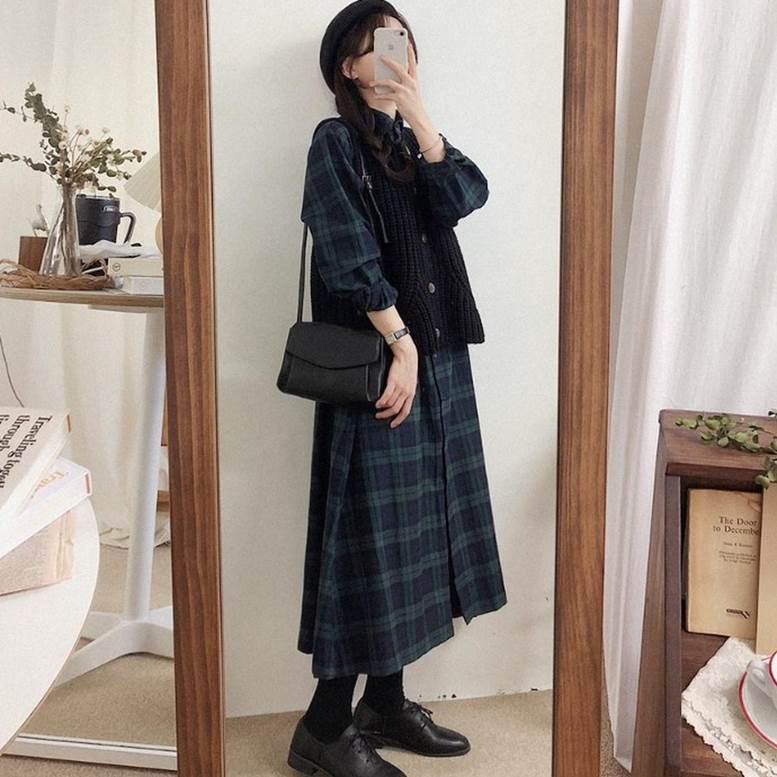 落ち感のある色合いのチェック柄がクラシカルなワンピース