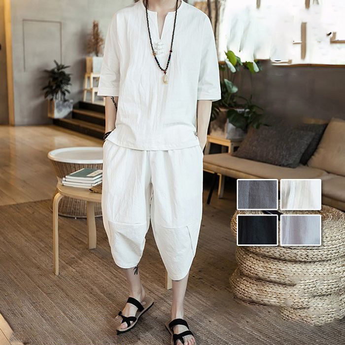 トップス メンズ 夏 2点セット リネン セットアップ 半袖 綿麻ジャージ 上下セット スウェット 半袖 部屋着 薄手 カジュアル 七分丈ズボン