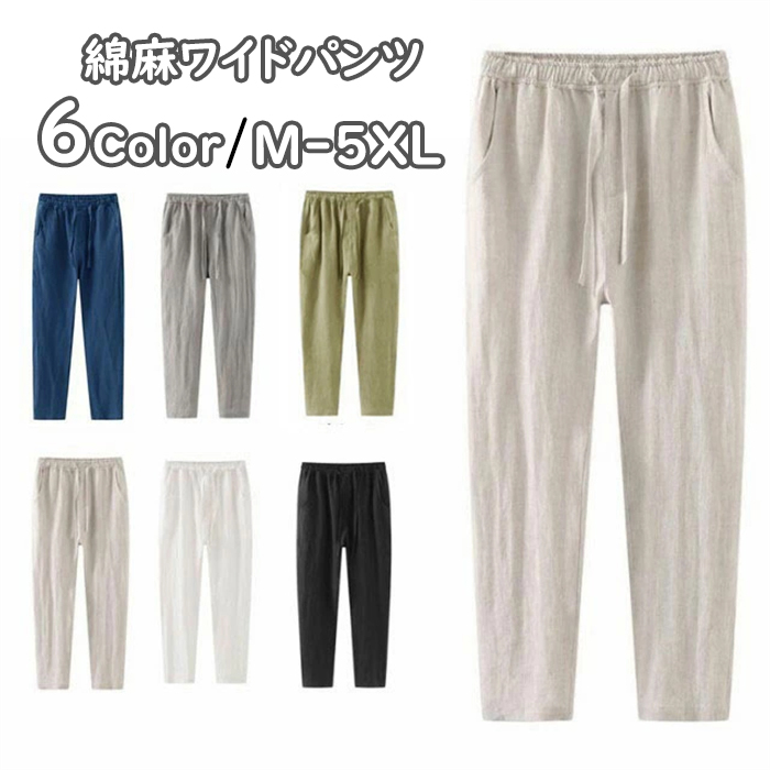 ~5 麻ワイドパンツ 薄手 春夏 ロング丈 ウエストゴム ナチュラルメンズファッション ズボン パンツ
