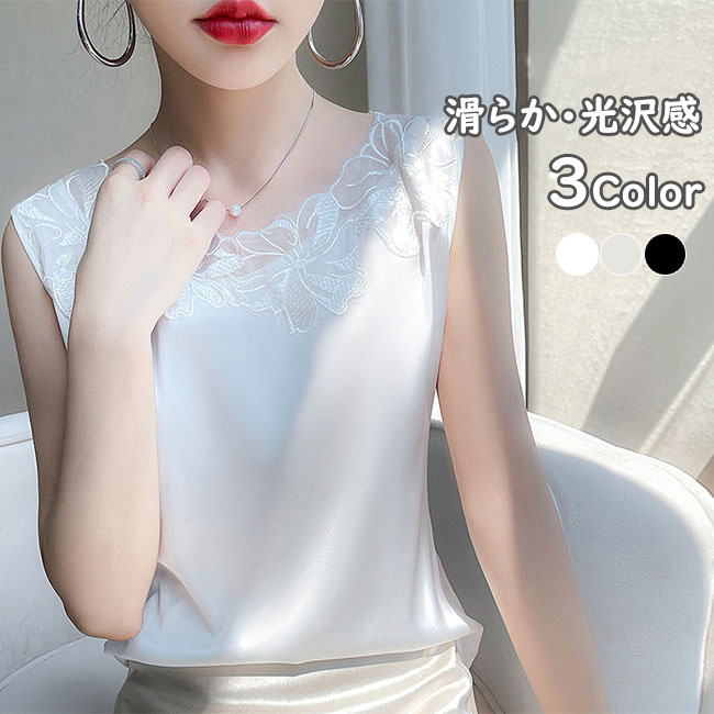 レディース ブラウス 夏 袖なし ノースリーブ サテン タンクトップ レースブラウス サテンブラウス 滑らか 光沢 軽薄 トップス レース襟 花柄レース レトロ セレモニー サテンタンクトップ 涼しい オフィス ホワイト ブラック
