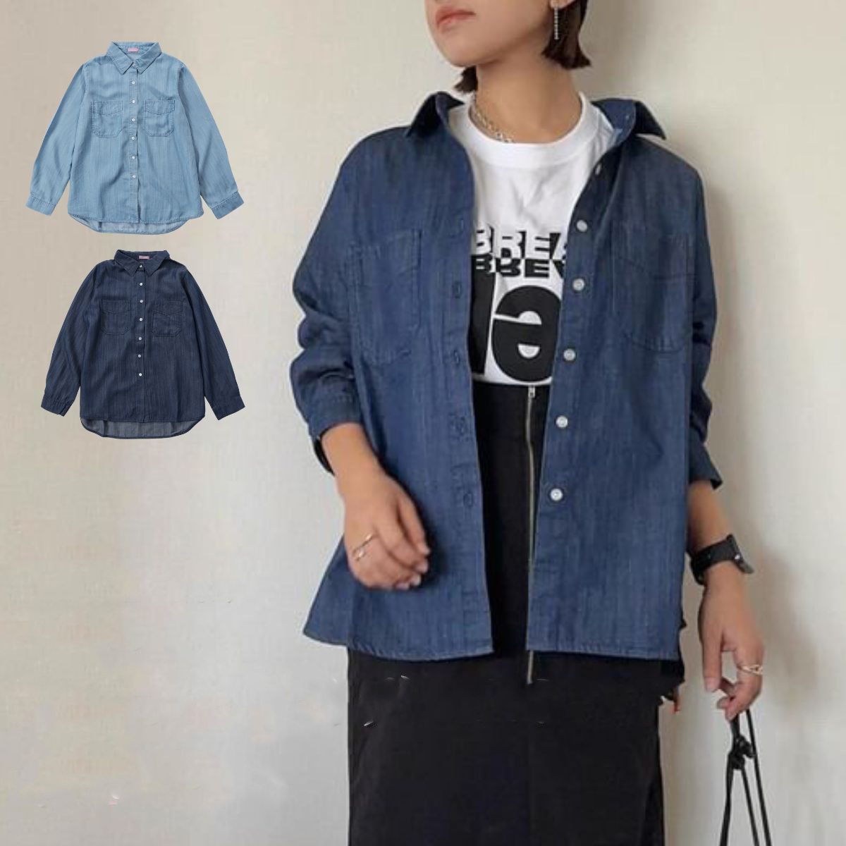 長袖 デニム シャツ デニムシャツ レディース ダンガリーシャツ 羽織り ブラウス ダンガリー おしゃれ かっこいい 韓国ファッション 襟付き ボタンシャツ 前開き 韓国 ブランド 20代 30代 40代 50代 大きいサイズ 春 秋 シンプル ブルー サックス