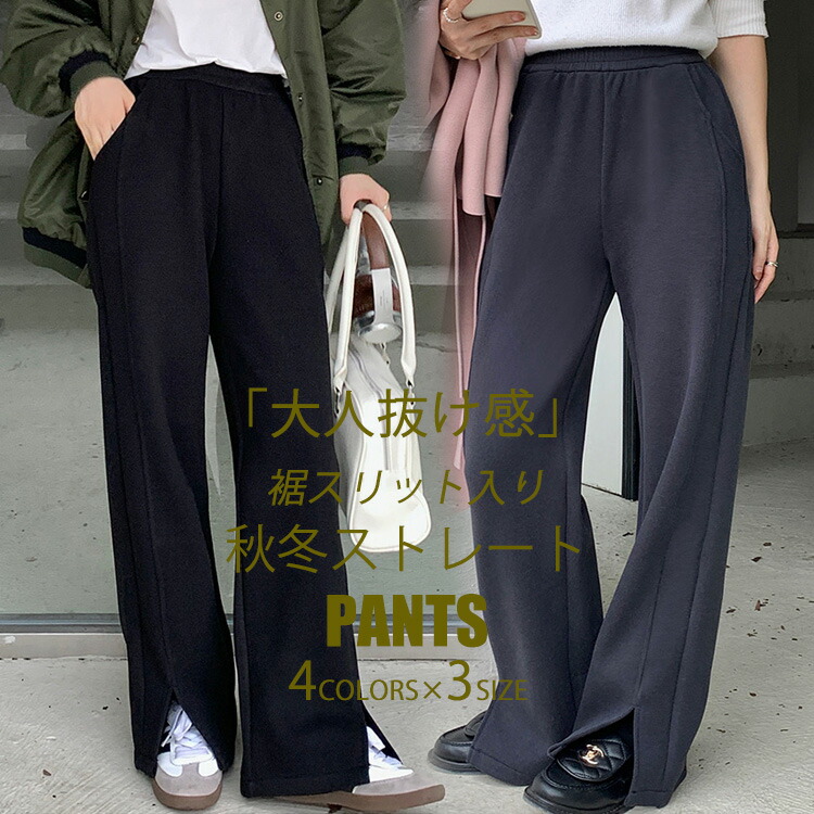 厚みのある秋冬向きストレートパンツ 裾スリット入り、大人の抜け感を演じる ロングワイドパンツ スリットパンツ ロングズボン シンプル 大人可愛い オシャレ きれいめ