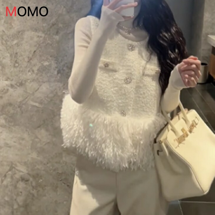 海外問屋直送 ツイード ジレジャケット プードル ジレ ベスト もこもこ感 暖かジレ 秋冬ジレ プードルフリルが可愛い S~XL 大人カジュアル