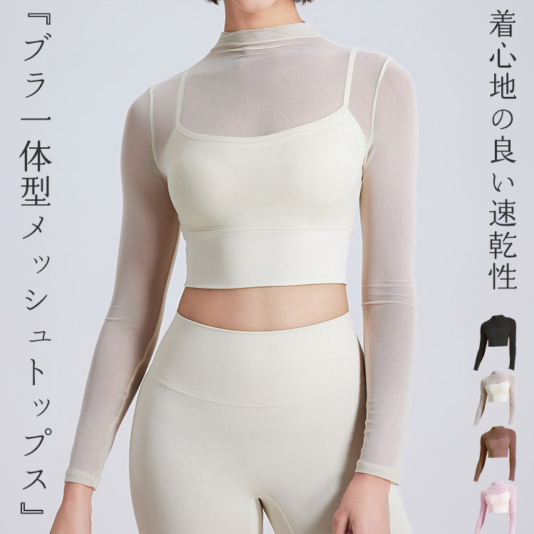 ブラ一体型で1枚で着れる ヨガトップス ヨガウェア 女性 シアートップス ブラトップ 伸縮性 クロップド丈 透け感 スポーツウェア