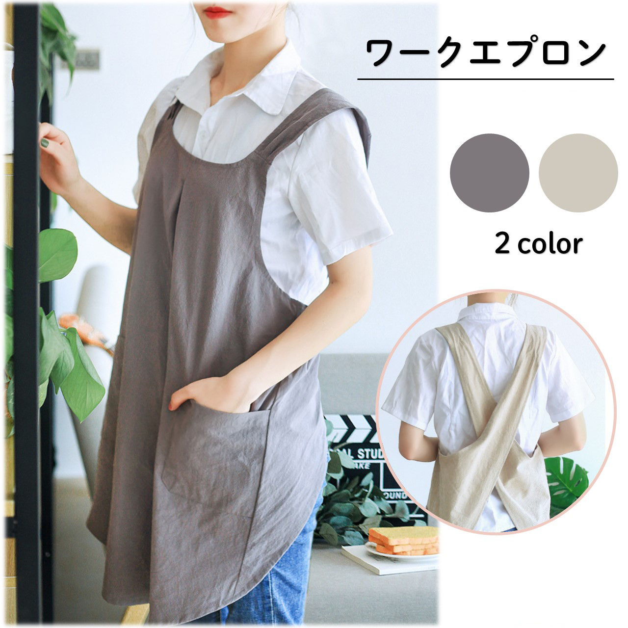 エプロン 無地 バッククロス リネン コットン ワンピース風 北欧風 ナチュラル シンプル おしゃれ ナチュラル 綿 麻混 すっぽり ベージュ グレー 保育士 介護 仕事着 作業 主婦 プレゼント ギフト かわいい 楽 肩こりしない ゆったり