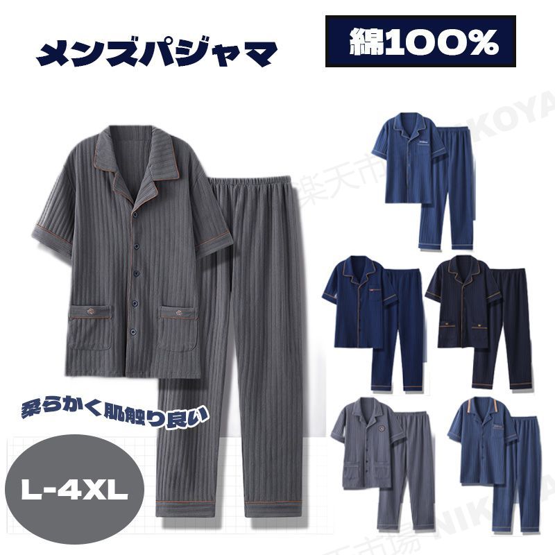 綿100% 柔らかく肌ざわり良い メンズ 半袖 パジャマ 夏用 夏用薄手 上下セット 前開き テーラー襟無地 おしゃれ 紳士 入院普段使い 160 170 180 190