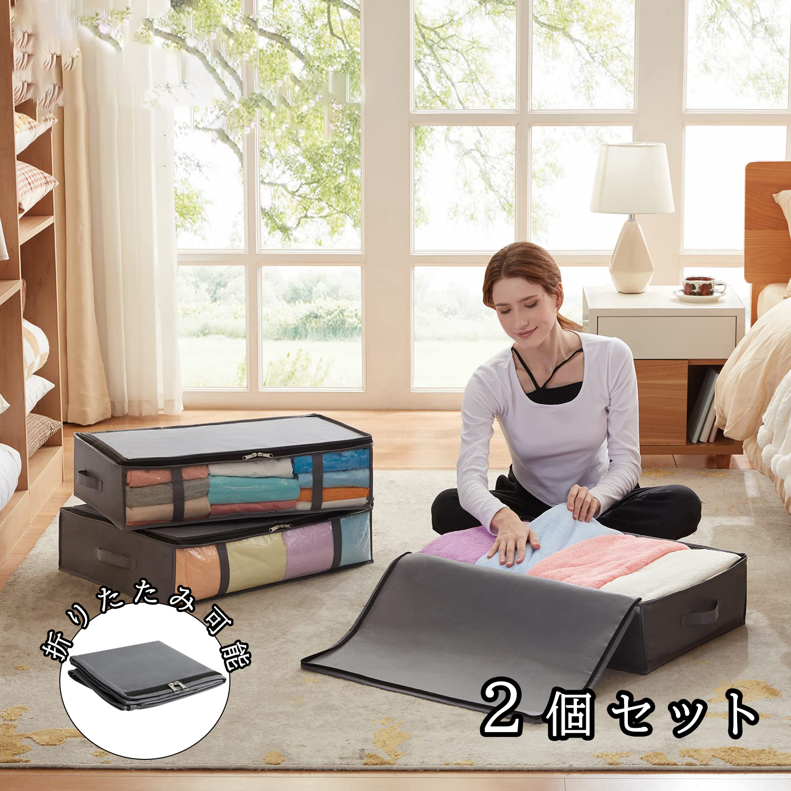 2個セットー 特大容量 ケース 折りたたみ 強固なプラスチック側壁板 ベッド下収納ボックス ケース 厚い底 積み重ね可能 洗える ベッド 衣装ケース 収納ボックス 衣類収納 布団ケース 収納 強化ファスナー 折り畳み 通気 耐久性 透明窓